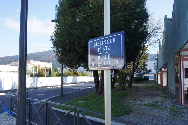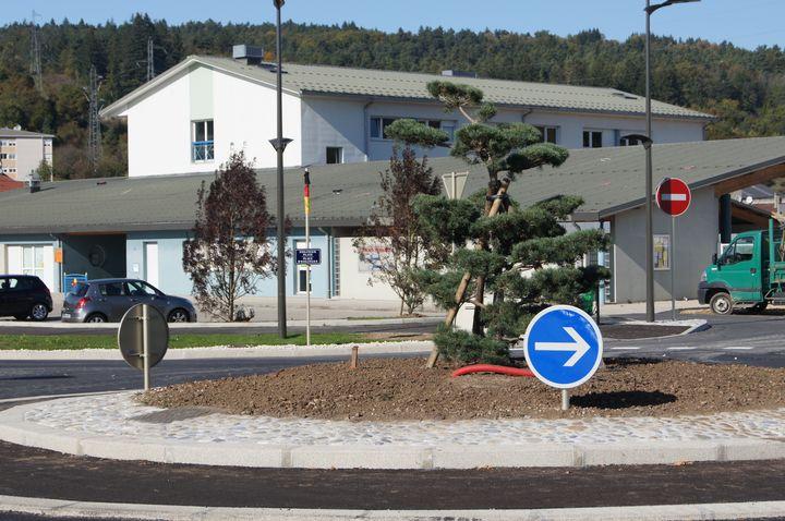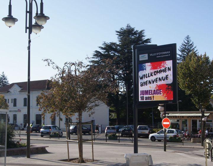 Die Eislinger Stadtfahne hängt schon im Auditorium des Kulturhauses und auf allen digitalen Infotafeln wird das Fest beworben. Am neuen Kreisverkehr, der auf den Namen Place des Eislingen morgen getauft werden soll, werden noch die letzten Arbeiten durchgeführt. Der französiche Jura zeigt sich unter blauen Himmel bei strahlender Herbstsonne. Infotafel am Bahnhof Oyonnax |