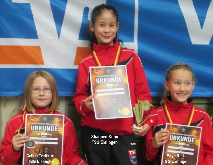 Bei den Schülerinnen des mittleren Schülerjahrganges 2001 durfte zur Freude aller TSG’ler die Dominanz unserer Sportlerinnen festgestellt werden. Shannen Kuhn wurde Erste, Celina Treffkorn Zweite und Enya Reik belegte den dritten Platz. Dass auf dieses Eislinger Trio Verlass ist, zeigte auch der tags zuvor am Samstag ausgetragene Mannschaftswettbewerb. Unterstützt wurden die drei noch von der ein Jahr älteren Nina Kottmann, da bei Mannschaftswettbewerben mehrere Jahrgänge zulässig sind. Dieses Team belegte nach den unschlagbaren und ein Jahr älteren Mädchen aus Künzelsau den zweiten Platz. Dabei besiegten sie zwei weitere Eislinger Teams, wo mit Annette Kramer, Inga von Buch, Lea Hartmann und Katja Binder der ältere Jahrgang am Start war. Dieses Team wurde dann noch Dritter.