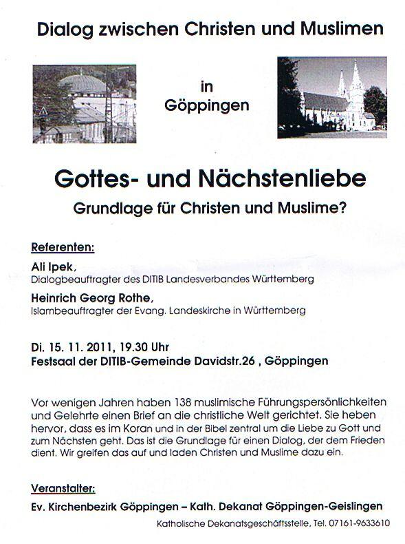 Der Dialog wird nächste Woche fortgesetzt: Am Dienstag, 15.11.2011 dinder um 19:30 Uhr ein Gespräch über 'Gottes- und Nächstenliebe. Grundlage für Christen und Muslime?' im Festsaal der DITIB-Gemeinde in der Davidstaße 26 in Göppingen statt. Impulsreferate kommen von Ali Ipek, dem Dialogbeauftragten des DITIB Württember und Heinrich Georg Rothe, dem Islambeauftragten der Evang. Landeskirche Wttbg.