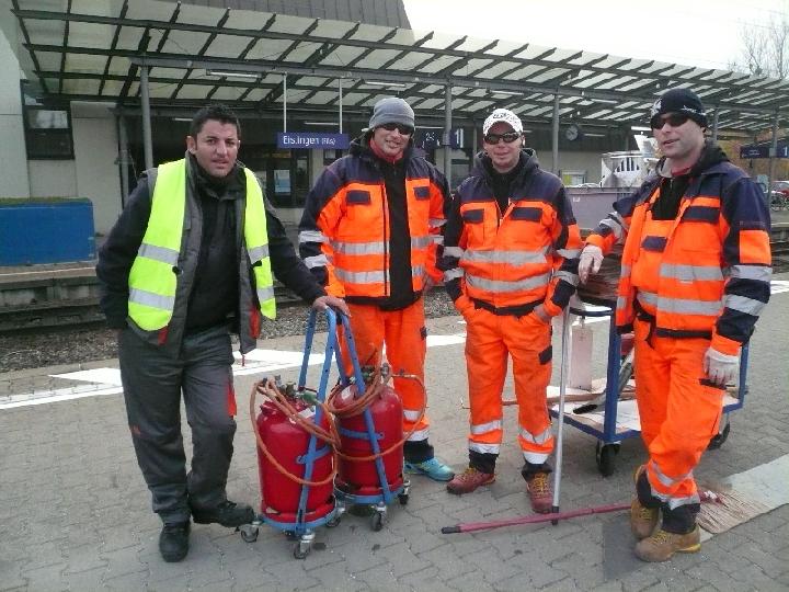 Bei Eiseskälte und Sonnenschein markierten ein DB-Team aus Dresden die Bahnsteigkanten des Eislinger Mittelbahnsteigs. Damit scheint dann nicht mehr im Wege zu stehen, den schon lange fertiggestellten Aufzug in Betrieb zu nehmen. 'Eigentlich sollte heute die offizielle Freigabe erfolgen'. Wer erinnert sich noch, wann die SPD den Antrag auf Bau eines Aufzugs gestellt hat? Immerhin noch in diesem Jahrhundert.Und vor 2100 wird der Aufzug doch in Betrieb gehen, oder? Die Sicherheitsaufsicht im Kontakt mit dem Stellwerk, warten des Teams auf einen vorbeifahrenden Zug |