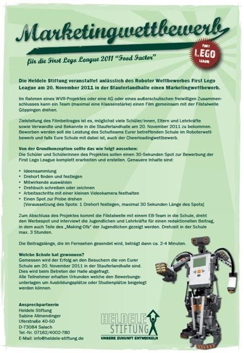Am 20.11.2011 steigt der First Lego League der Heldele Stiftung in Salach. Ab 9:00 treten in der Stauferlandhalle in Salach Roboterteams in Wettbewerben gegeneinander an. Die Klasse 8 b nimmt zusammen mit ihrem Lehrer Sebastian Grom am Marketingwettbewerb für die Veranstaltung statt. Diesen können sie nur gewinnen, wen möglichst viele Gäste sich als Eislingerinnen und Eislinger, geworben von der Dr.-Engel-Realschule outen. |
