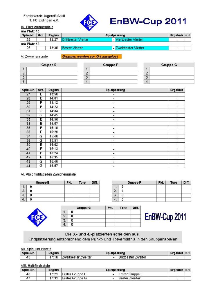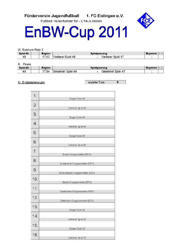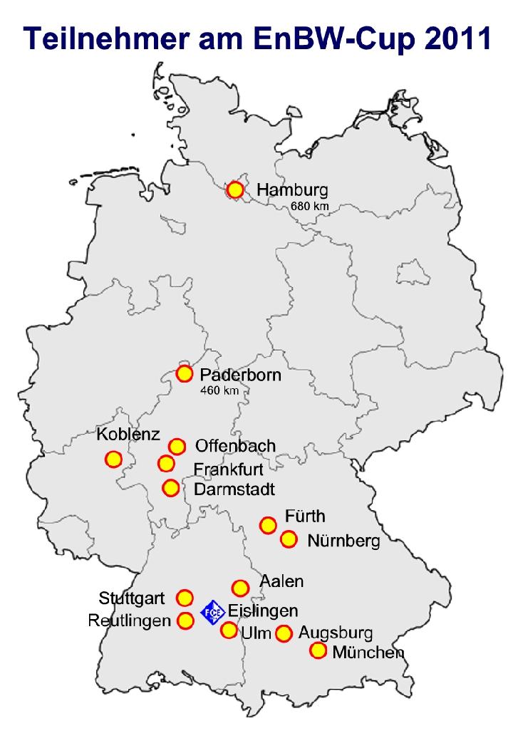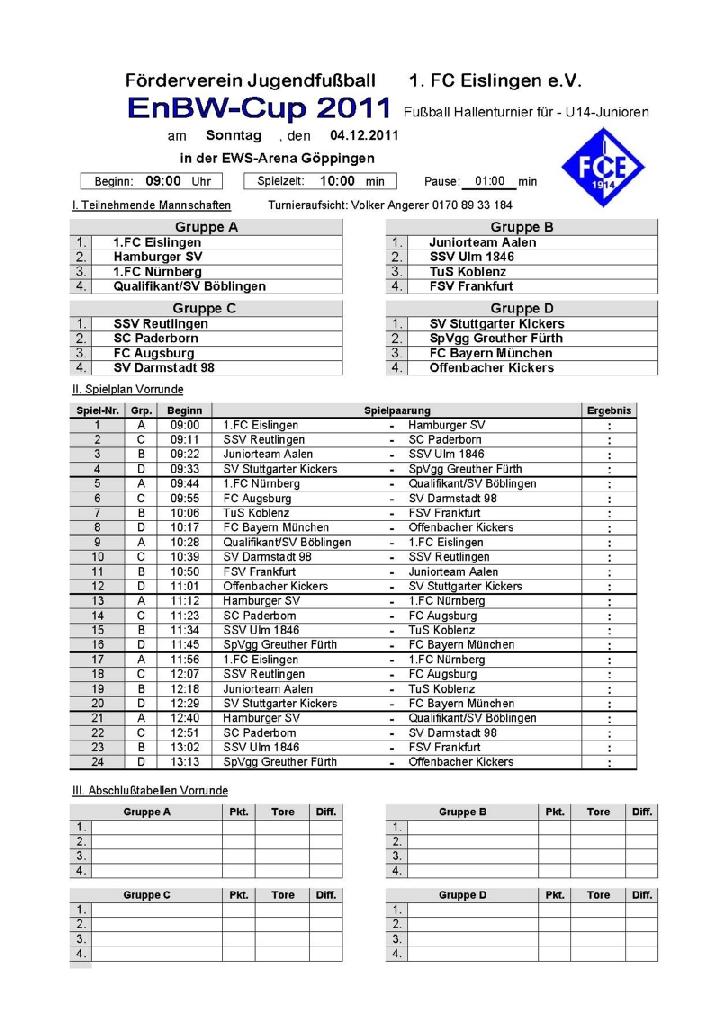 Neben dem Titelverteidiger 1. FC Bayern München entsenden am 04. Dezember 2011 nachfolgend genannte Vereine ihre U14 Junioren nach Göppingen in die EWS Arena zum 3. EnBW U14-Cup: