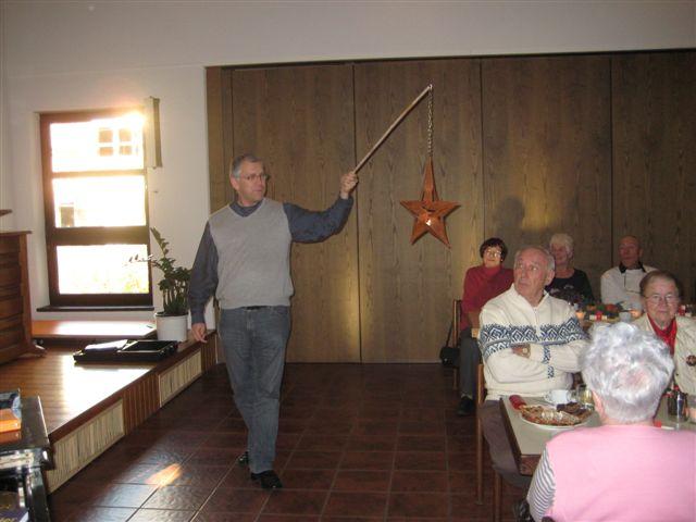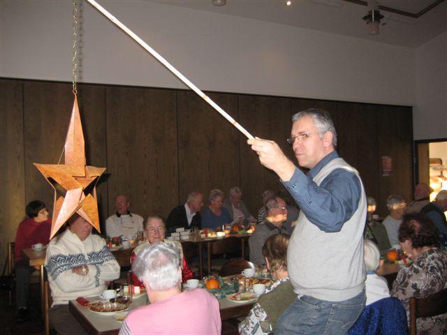 In seiner Andacht zu Beginn der besinnlichen Feier bedachte Diakon Hilsenbeck den Weg des Lichts und der Sterne, die uns gerade auch in der Adventszeit begleiten und uns allen den Weg weisen möchten. Die Geschichte von Zacharias, dem Vater Johannes des Täufers, kann uns auch heute ein Bespiel sein für die Sterne, die auf dem Lebensweg eines jeden Einzelnen immer wieder aufleuchten. Gerade im Advent sollen wir unsere Aufmerksamkeit diesen Zeichen zuwenden, sie wahrnehmen und sie in dieser etwas anderen Zeit auf uns wirken lassen. Das Lied „Macht hoch die Tür“ erklang zum Abschluss der Andacht und leitete über zur Ehrung der Jubilare, die seit dem letzten Seniorennachmittag ihren Geburtstag feiern durften. Die Liedwünsche der Jubilare, die ausnahmsweise alle aus dem Gesangbuch ausgewählt wurden, wurden nach dem Kaffeetrinken gemeinsam gesungen.
