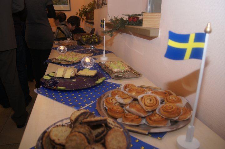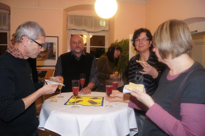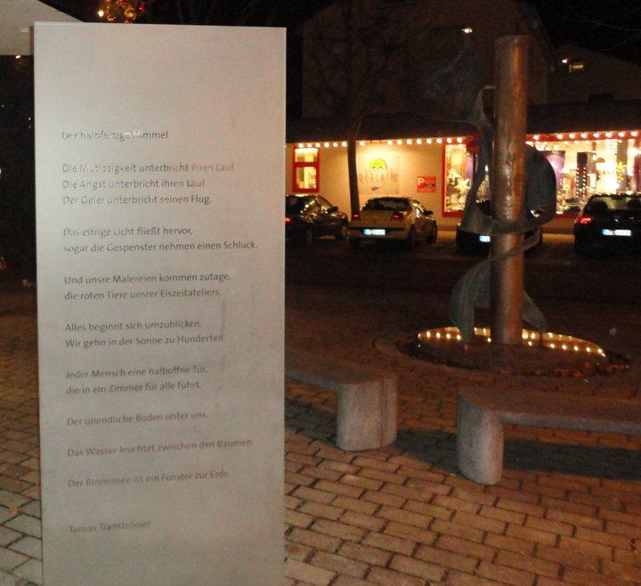 Er war auch in der Planung, aber erst der diesjährige Nobelpreis für Literatur an Thomas Tanströmer gab den Anstoß den Eislinger Poetenweg um eine Stele zu erweitern. Dank Sponsoren konnte am Brunnen vor der Volksbank eine weitere Stele aufgestellt werden, deren Enthüllung mit einem kleinen schwedischen Buffet in der Stadtbücherei gefeiert wurde. Helén Meyer-Keller stellte nicht nur die schwedischen Spezialitäten zur Verfügung, sondern präsentierte in Zusammenwirken mit Tina Stroheker die Tranströmer-Gedichte in Schwedisch.