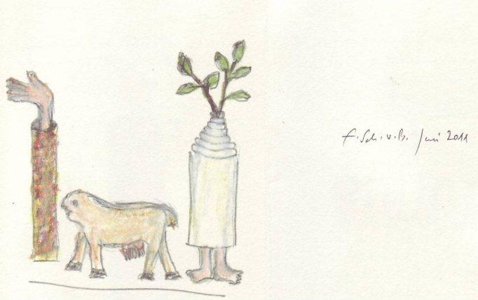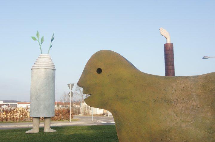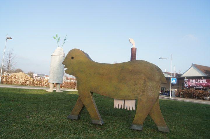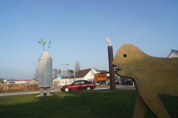 'Die siebte Bestückung einer Kreisverkehrsinsel in der Stadt Eislingen/Fils ist nun von obigen F.Sch. eingerichtet worden. Die bisherigen sind im Land als eine Besonderheit schon weit bekannt. Diesmal ist auch eine Jahrtausend-und-einhundertfünfzigjährige Ortsgründungsfeier ein weiterer Anlaß, neues dazuzubringen. Darum also kein Wunder, daß jetzt 3 Bildhauerwerke statt einem zur Aufstellung kommen. Diese drei dürfen nun miteinander ihre Geschichten erzählen und verkünden, sowie singen und tanzen als Eines. Hand und Fuß zeigen Bewegung; und frische Zweige deuten Wachstum in die Höhean. Namen sind ihnen noch keine gegeben, der Betrachter und der Nahekommende mag jedesmal seinen eigenen Verleihen.' So schreibt Fritz Schwegler selbst in einem Begleitheft zur Kreiseleinweihung des siebten Kreisels an der neuen Osttangente. |