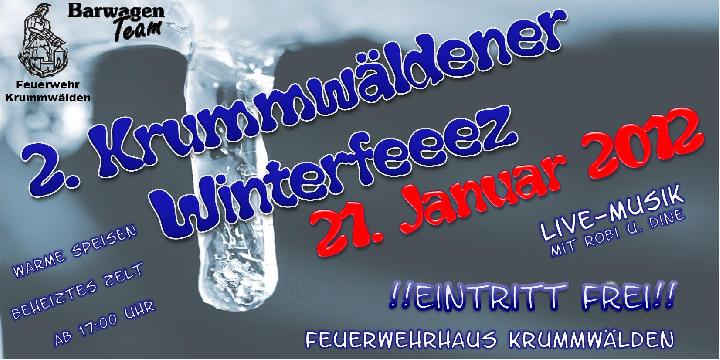 Am Samstag, den 21. Januar 2012, ist es wieder soweit. Der Krummwäldener Winterfeeez, eine Kooperation vom Barwagen-Team e.V. und des Löschzug 3 Krummwälden der Freiwilligen Feuerwehr, findet zum zweiten Mal statt. Alle Gäste aus Nah und Fern sind eingeladen, im beheizten Zelt am Feuerwehrgerätehaus Krummwälden Stimmung pur zu erleben. Das Duo Dine & Robi aus Salach sorgt wie bei der Premiere für die musikalische Unterhaltung. Flyer 2012 |
