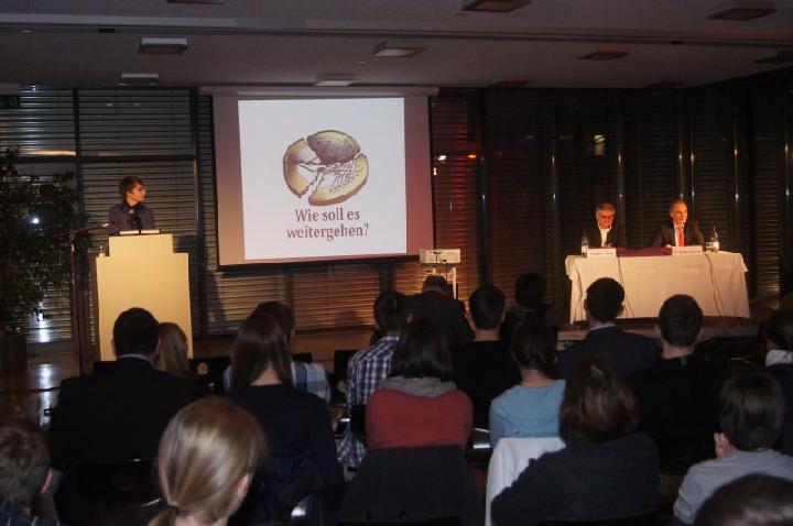 Die Politik-AG des Erich-Kästner-Gymnasiums hat sich mit der aktuellen Eurokrise beschäftigt und zu einer Diskussionsveranstaltung mit hochkarätiger Besetzung eingeladen. Der Einladung der Eislinger Schülerinnen und Schüler sind Jürgen Hilse, ehemaliger Sparkassenchef in Göppingen, sowie Dr.Dierk Hirschel, Chefökonom der Dienstleistungsgewerkschaft Ver.di gefolgt. |