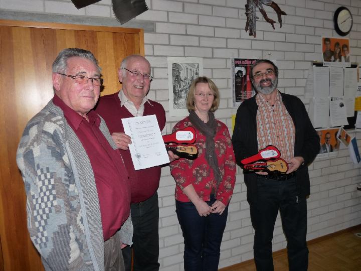 Sie ließ das vergangene Jahr Revue passieren und nach den folgenden Berichten konnte der gesamte Vorstand entlastet werden. Da keine Wahlen anstanden, machte sie gleich mit einem erfreulichen Top weiter, den Ehrungen. Für 25 Jahre passiver Mitgliedschaft wurden Hans Busch und Siegfried Riedmüller geehrt. Als Geschenk bekam jeder eine kleine Gitarre, eine Anstecknadel in Silber und eine Urkunde.