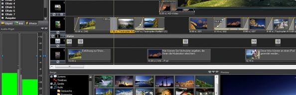 Sie gestalten Ihre Show mit Medienobjekten (Bilder, Töne, Videos, Texte, Fernsteuerbefehle, usw) in der Timeline.. Die Bearbeitung all dieser Objekte basiert auf einem einheitlichen Konzept und ist, wo immer von der Sache her möglich, identisch. Das macht das Arbeiten mit Wings Platinum besonders einfach. Auf den Spuren einer Timeline werden die unterschiedlichen Medien als Objekte in der gewünschten zeitlichen Abfolge angeordnet. Praktisch alle Bearbeitungen erfolgen nondestruktiv, das heißt, die originalen Mediendateien auf der Festplatte bleiben unangetastet erhalten und dadurch können alle Bearbeitungsschritte auch wieder rückgängig gemacht oder geändert werden. Für die unterschiedlichen Medien gibt es entsprechende Spurtypen, also beispielsweise Bild-, Ton-, Videospuren oder auch Marker-Spuren für Speaker Support.