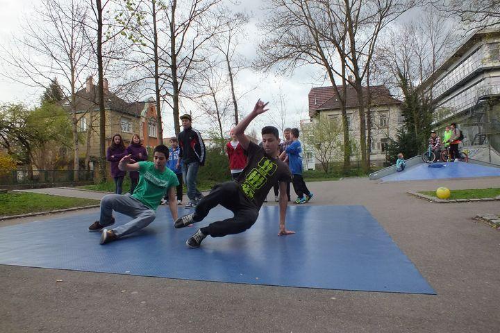 Ebenso sportlich, wie aber auch musikalisch ging es bei dem Breakdance Workshop zu. Die Göppinger Breakdancecrew „Turnshoe Reflex“ zeigte der bunt gemischten Gruppe die Grundkenntnisse des Breakdance und welche weiteren Moves es gibt. Mit viel Kraft haben sich die Kinder auf den Händen gehalten oder auf dem Kopf gedreht. In dem zweitägigen Workshop übten sie auch eine kleine Breakdancechoreografie für das Abschlussfest ein.
