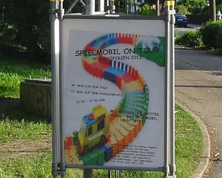 Das Spielmobil ist am Mittwoch, den 30. Mai 2012 vor dem Jugendhaus Talx und am Donnerstag, den 31. Mai 2012 auf dem Schillerplatz in der Stuttgarter Straße. Bei schlechtem Wetter entfällt das Spielmobil.