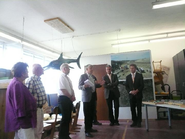 Das Land Baden-Württemberg und die Stadt Eislingen Hand in Hand, so präsentierte sich heute morgen das Team um Henrik Stöhr und Kreisarchäologen Dr. Reinhard Rademacher, sekundiert von Dr Christoph Speiser vom Förderverein Eislinger Saurierfunde (FES). Der FES hatte die Präparationswerkstatt eingerichtet, teilweise gesponsert von örtliche und regionalen Firmen und seit Anfang des Jahres hat Henrik Stöhr bereits ganze Arbeit geleistet, wie er in einer kurzen Präsentation wissenschaftlich fundiert zeigte. Aus den flächig geborgenen Schichtplatten der Grabungskampagne 2005 sind noch die Skelettreste eines Meereskrokodils und eines Fischsauriers zu erwarten. Das interessierte Presse- und Verwaltungspublikum wurde ausführich über die Bestimmungsmethoden und die Arbeitsweise des Präparators informiert. OB Klaus Heininger bedankte sich eingangs für die Unterstützung des Landes (vertreten durch den damaligen Kulturstaatssekretär Dr Birk) und wies auf das Alleinstellungsmerkmal Saurierfunde für die Stadt Eislingen hin. Dr Rademacher berichtet vor (von rechts) OB Heininger, MdL Dr Birk und BM Fitterling |
