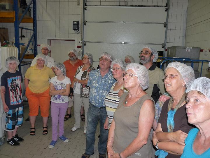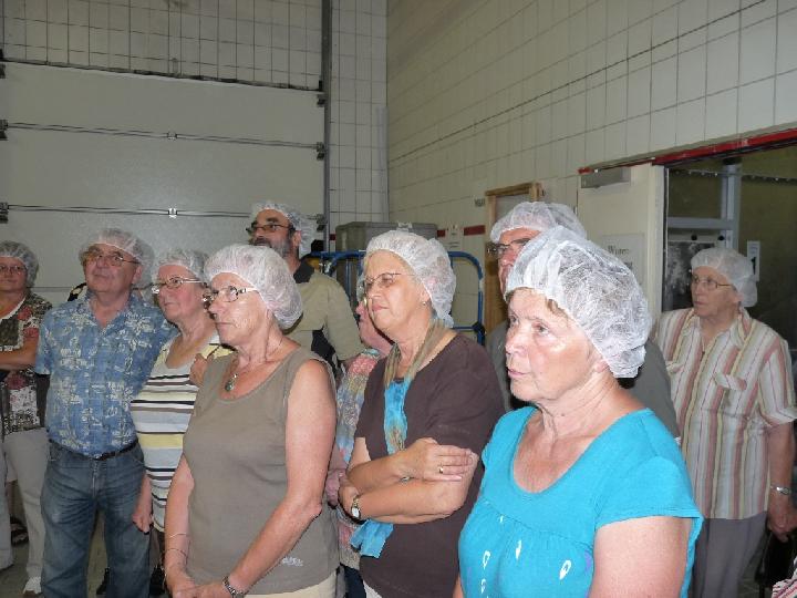 Zur Besichtigung der Bäckerei bekamen die Besucher eine Haube verpasst. Die Frauen wurden dadurch nicht schöner, aber für die Hygiene brachten sie dieses Opfer gern. Herr Mayer erklärte uns die verschiedenen notwendigen Maschinen, und es stellte sich dabei heraus, dass noch viel Handwerk übrig blieb. Die anstrengendste Arbeitsstelle ist dabei die Arbeit vor den Öfen. Die Temperatur ist hier am höchsten und die Gewichte die zu heben sind am größten. An diesem Arbeitsplatz wird das Personal regelmäßig ausgetauscht. Weniger anstrengend geht es in der Konditorei zu. Dahin flüchtet der Chef, wenn es ihm zu warm wird.