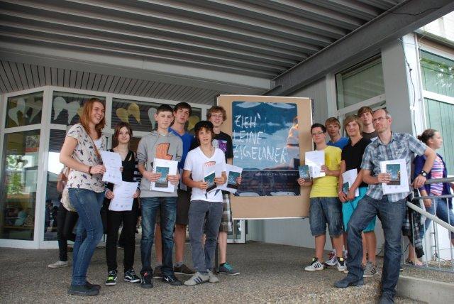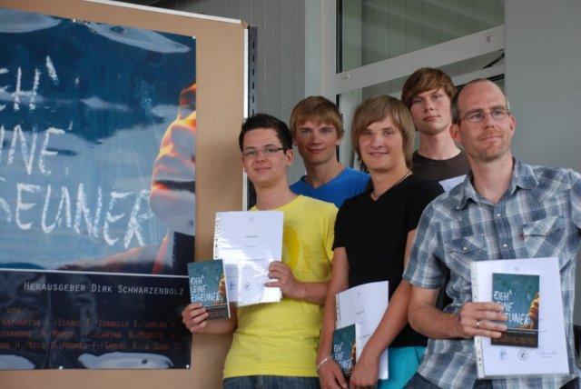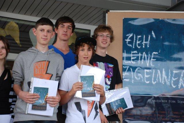 Moritz Held und Samuel Rosenberger stellten anschließend als Co-Autoren das neue Buch „Zieh‘ Leine Zigeuner“ vor, welches sie gemeinsam mit 13 weiteren Schülern und ihrem Deutschlehrer Dirk Schwarzenbolz in ihrer Freizeit verfasst haben. Im sehr authentischen Buch erlebt ein rumänischer Junge namens Calin Anfeindungen von Mitschülern, aber auch wahre Freundschaft und Liebe. (ISBN 3-978-8236-1635-1)