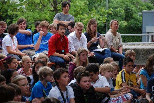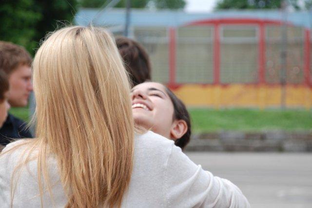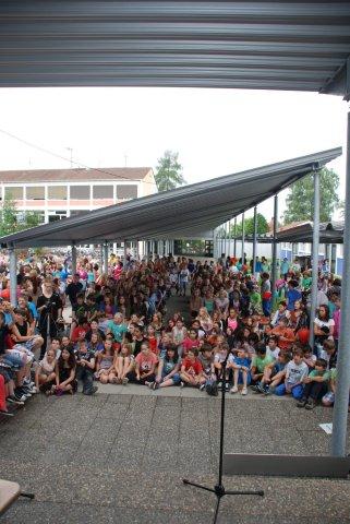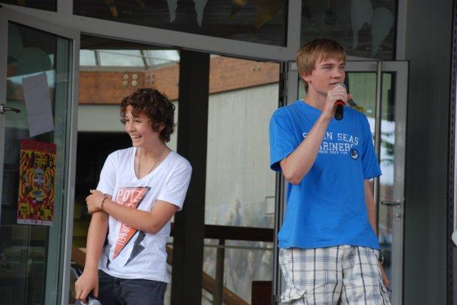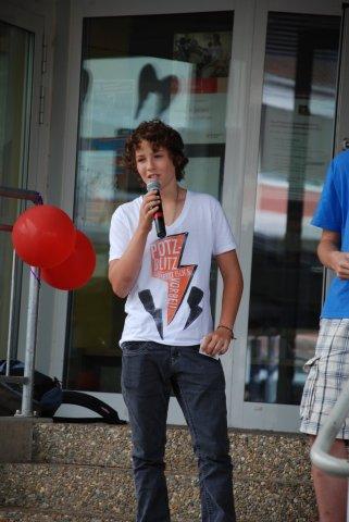 Gut gelaunt sammelten sich schon während der großen Pause die ersten Schüler auf den Bänken vor dem Neubau und warteten auf den Beginn des angekündigten Open-Air-Events. Alexandra Schlosser (Schülersprecherin) und Laura Darabos eröffneten die Veranstaltung musikalisch und konnten die Schüler direkt zum Mitklatschen begeistern. Die Schülersprecherin übernahm im Anschluss gekonnt Moderation und gab das Wort an ihren Schulleiter, Herrn Fischer, weiter. In seiner kurzen Ansprache sprach Herr Fischer lobende Worte für die engagierten Schüler beider Projekte und forderte auch weiter zu freundlichen und friedlichen Umgang miteinander auf.