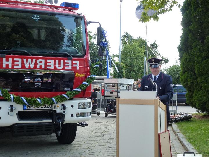 Launig begrüßte OB Klaus Heininger das neue Mitglied in der Feuerwehrfamilie als 'stattlichen Burschen' mit 13 000 Kilo Geburtsgewicht und kraftstrotzend mit 290 PS, und übergab den ihm vom Firmenvertreter Hermann Quintenz überreichten Schlüssel an den Kommandanten Martin Stingl 'zum sicheren Einsatz ohne Unfälle'.