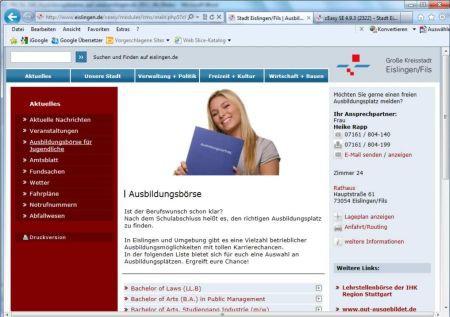 Auf der Homepage der Stadtverwaltung Eislingen gibt es dazu künftig ergänzend zu den bisherigen Informationsangeboten eine Ausbildungsbörse, auf der Ausbildungsbetriebe aus dem Kreis ihre freien Ausbildungsplätze anbieten können.