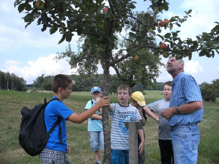 Bei herrlichem Wetter trafen sich am vergangenen Freitag interessierte Jungs beim Dorfgemeinschaftshaus in Krummwälden, um den vom Obst- und Gartenbauverein Krummwälden e.V. im Rahmen des Sommerferienprogramms angebotenen Nachmittag auf der Streuobstwiese zu verbringen. In einer überschaubaren Gruppe ging es zum von der Stadt Eislingen mit Unterstützung der Obst- und Gartenbauvereine Eislingen-Nord, Eislingen-Süd und Krummwälden angelegten Streuobstpfad am Ortseingang von Krummwälden. Der Zeitpunkt war ideal, da auch die meisten der relativ neu gepflanzten Streuobstbäume dieses Jahr schon Früchte tragen und teilweise verkostet werden konnten, wobei aus Apfel bzw. Zwetschge öfters ein Bewohner grüßte. Amüsiert zeigten sich die Jungs über verschiedene Sortennamen, die mit weiteren Informationen von den bei den Bäumen angebrachten Tafeln abgelesen werden können.