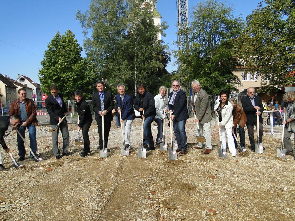 Bestaunt von zahlreichen Kinderaugen trafen sich Entscheidungsträger, Planer und Verantwortliche bei strahlendem Sonnenschein zum ersten Spatenstich für das Neubauprojekt.