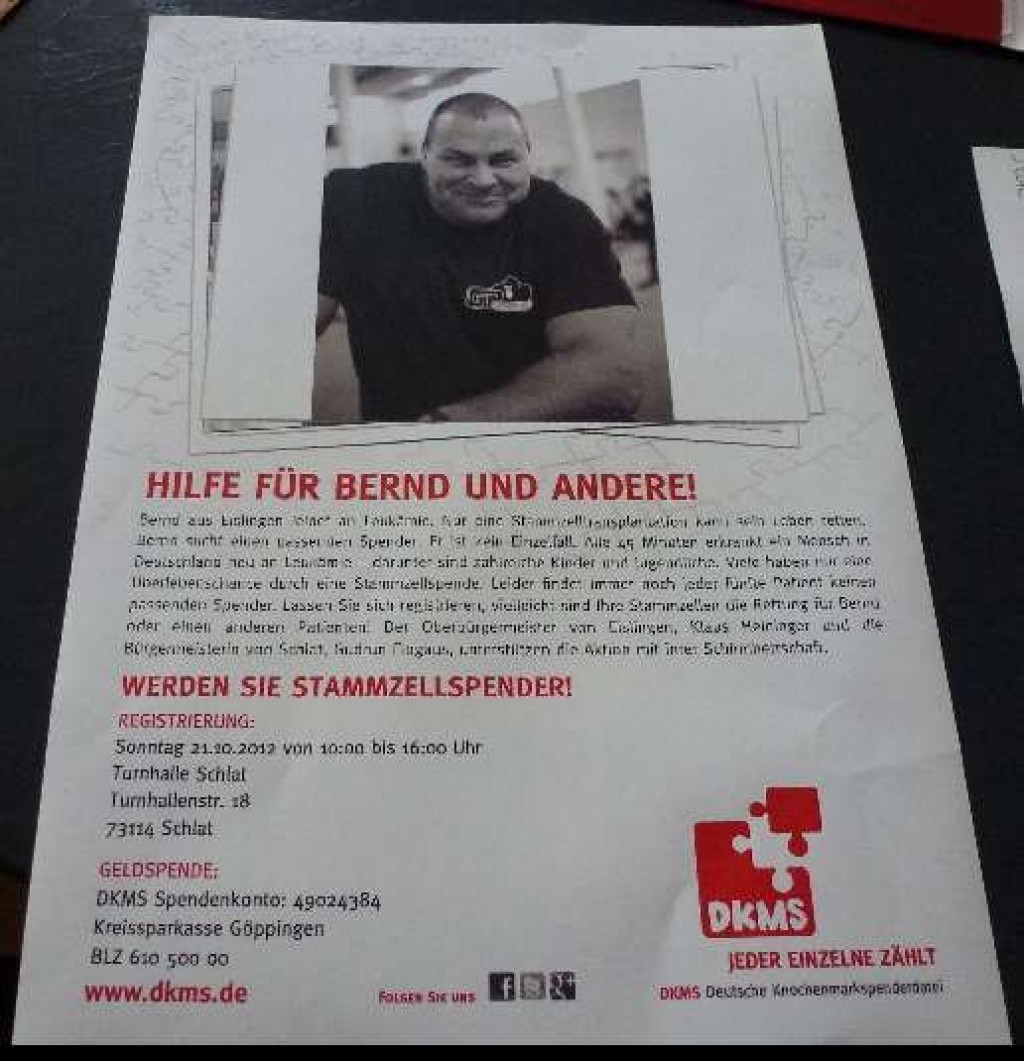Die DKMS Deutsche Knochenmarkspenderdatei gemeinnützige Gesellschaft mbH veranstaltet am Sonntag, 21.10.2012, in der Turnhalle in Schlat eine Registrierungsaktion.