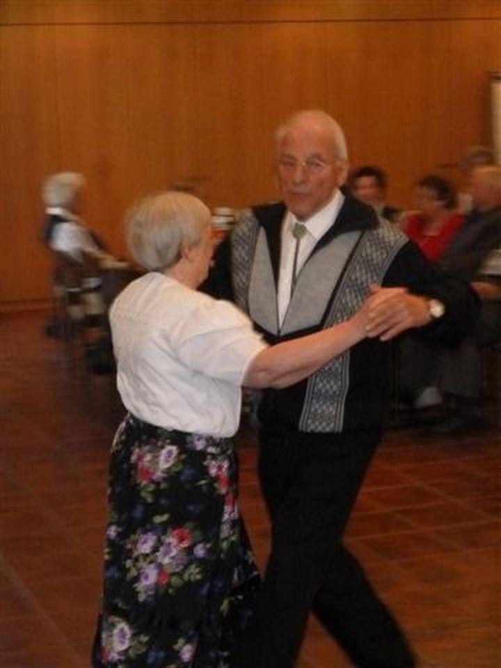 Das „Lob für den Nachmittag“ wurde paarweise getanzt. Der israelische Tanz „Tritte“ machte den Zuschauern so viel Spaß, dass die Wiederholung mit Herrn Hilsenbeck und vielen Gästen getanzt wurde. Nach weiteren Darbietungen bedankte sich Herr Hilsenbeck mit einem Blumenstrauß. Eine ganz besondere Zugabe war der Tanz des Ehepaares Jauss zur gesungenen Figurenansage „Music for Dance“.