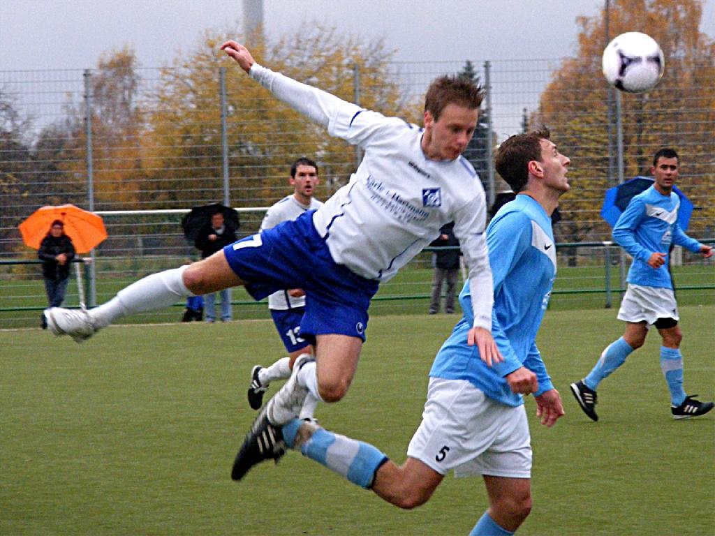 tr.) Einen ungefährdeten 6:0 Kantersieg landete der FC Eislingen gegen den bisherigen Tabellensechsten TSV Wäldenbronn-Esslingen. Dabei fand der FC vom Anpfiff an gut in die Partie und ging frühzeitig in Führung. Der aufgerückte Defensivspieler Robin Reichert war mit einem platzierten Flachschuss schon in der 2. Spielminute erfolgreich. In der Folgezeit ließen die gut spielenden Eislinger Ball und Gegner laufen und Marco Frank wäre beinahe das 2:0 gelungen. Das besorgten die Gäste dann von selbst. Serdar Kurt setzte sich nach langem Ball von Steffen Dangelmayer auf der Außenbahn energisch durch, seine flache Hereingabe fälschte der ehemalige Eislinger Srdjan Mojasevic etwas unglücklich ins eigene Tor (16.). In der 35. Spielminute vollendete Daniel Kaluderovic einen schulmäßigen Eislinger Konter zur beruhigenden 3:0 Halbzeitführung für die Blau-Weißen. Nach Wiederbeginn brachten sich die Eislinger auch durch unnötige Kommentare in Richtung des Schiedsrichters selbst etwas aus dem Konzept. Besonders bei Standardsituationen waren die Gäste einige Male gefährlich und der gut haltende Eislinger Torhüter Michael Bantle musste einige Male eingreifen um den durchaus möglichen Anschlusstreffer zu verhindern. Erst in der Schlussphase nahm das Eislinger Spiel wieder Fahrt auf. Marco Frank erlief einen zu kurzen Rückpass und markierte in der 74. Spielminute das 4:0 für den FCE. Eine Zeigerumdrehung später wurde David Hilger im Strafraum gefoult. Den fälligen Strafstoß verwandelte Liridon Elezaj sicher zum 5:0 für den FC. In den Schlussminuten spielten die Gäste nur noch mit zehn Akteuren die Parite zu Ende. Majk Vujevic musste nach wiederholtem Foulspiel mit der Gelb-Roten Karte vorzeitig zum Duschen. Den Schlusspunkt unter eine gelungene Eislinger Vorstellung setzte Serdar Kurt der in 85. Spielminute nach Zuspiel von Marco Frank zum 6:0 für den FCE traf. Marco Frank im Luftkampf |