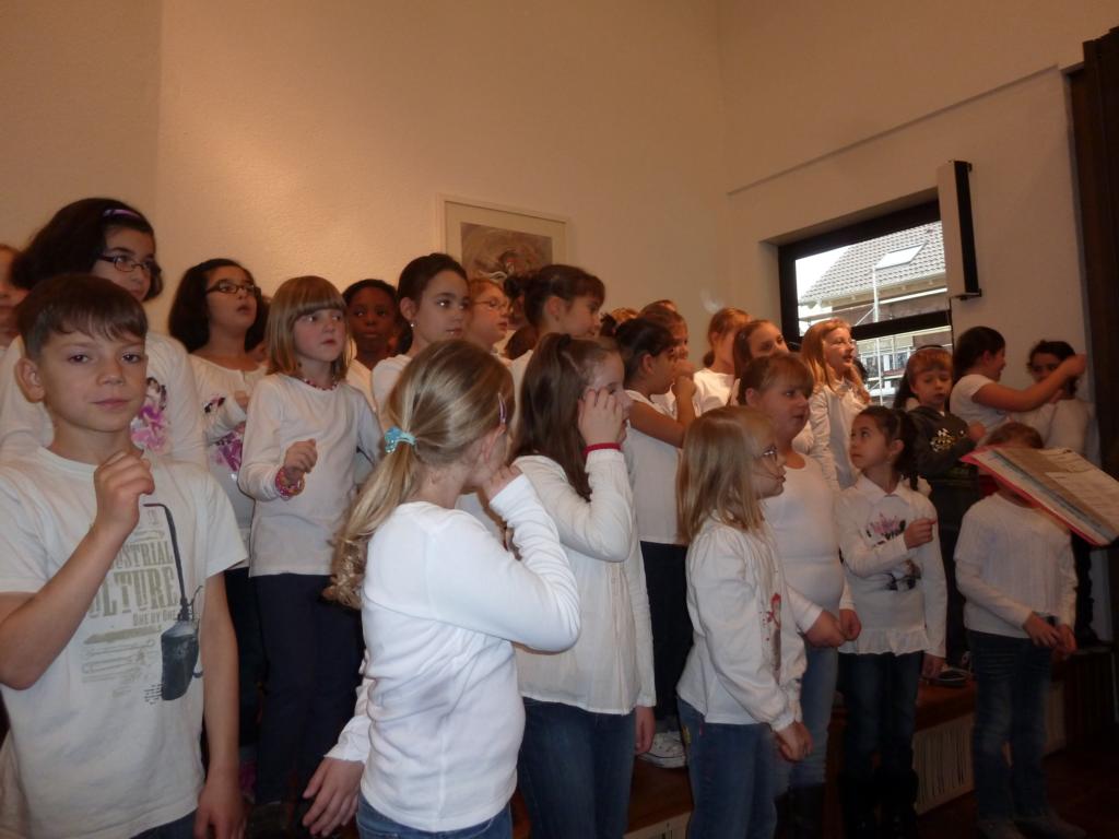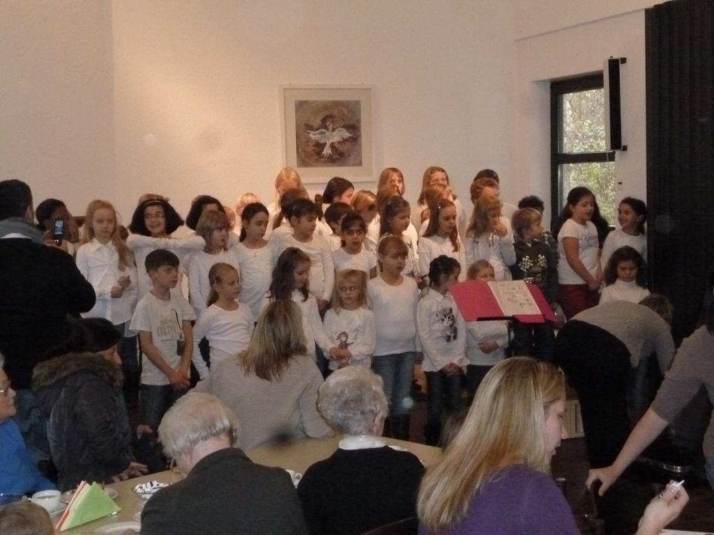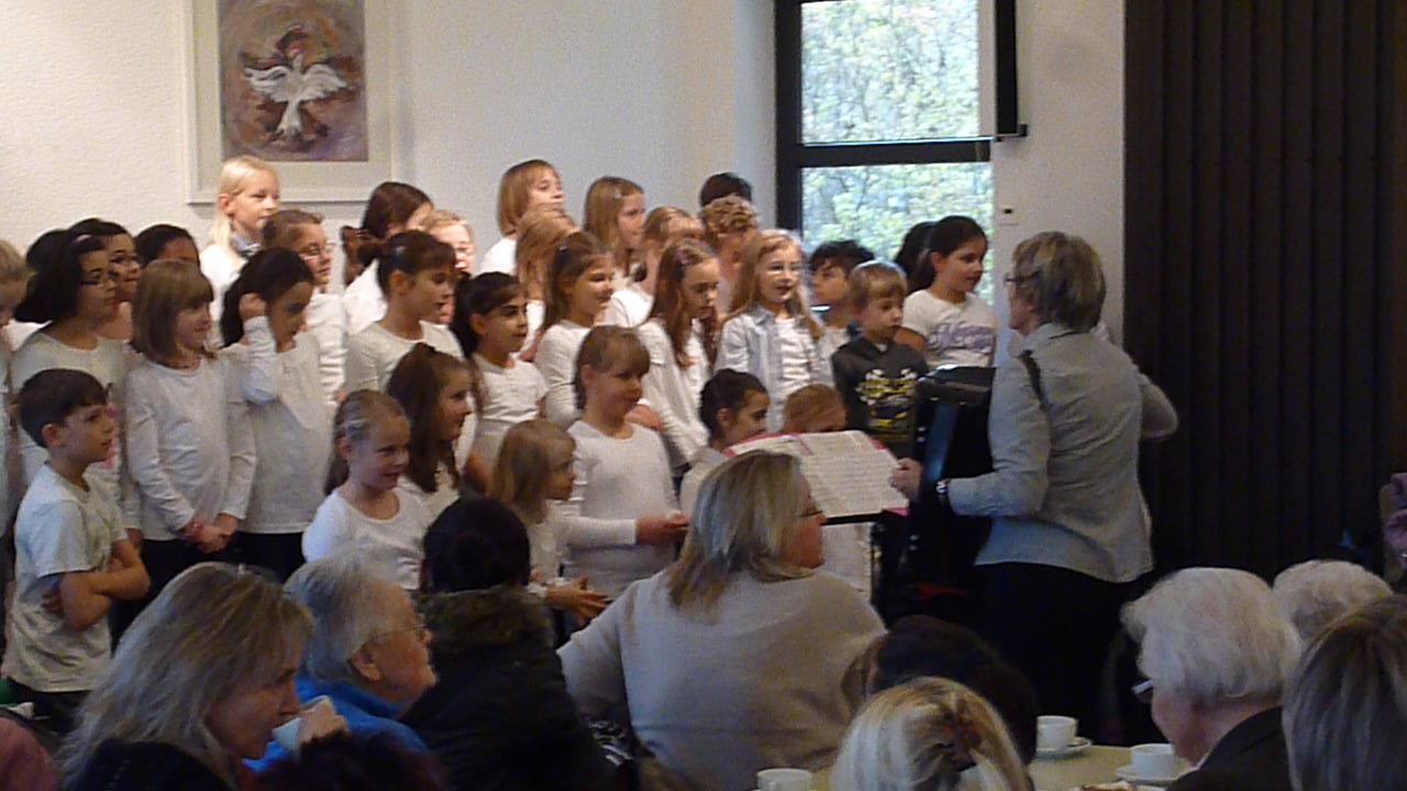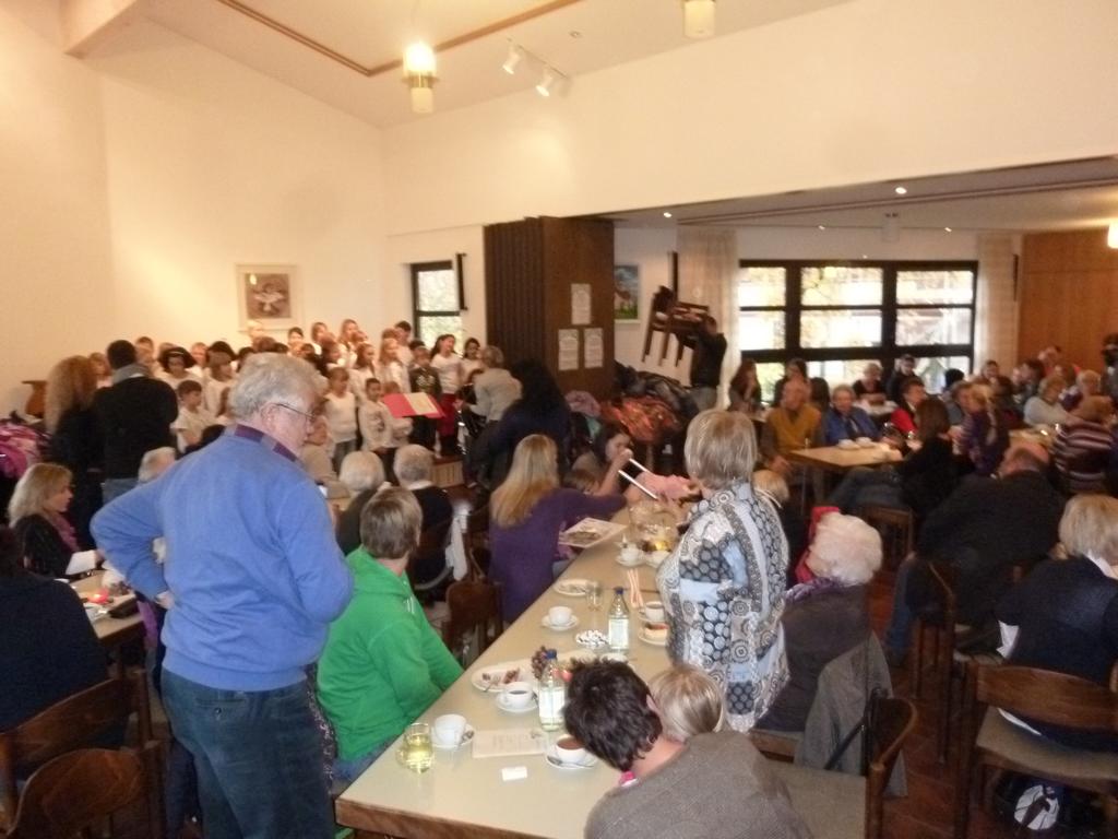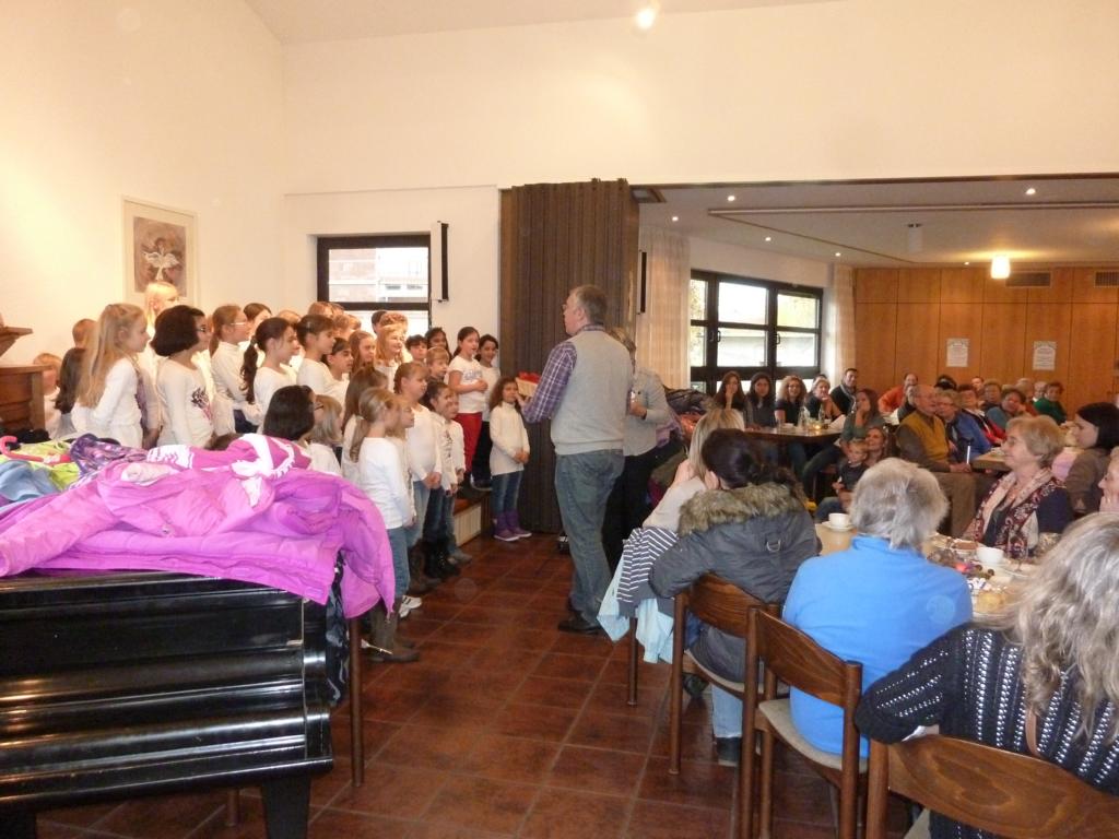 Das Kaffee- und Kuchenbüffet war wieder wohl sortiert und lockte mit einem vielseitigen Angebot, das gerne wahrgenommen wurde. Gerade richtig zur Kaffeezeit kam der Auftritt de Schulchores der Schillerschule und Leitung von Susanne Pietrass. Mit großer Begeisterung boten die Kinder ein tolles Programm im vollbesetzten Gemeindehaus, das sie mit einer Zugabe beendeten. Das Spiel- und Bastelangebot für die kleinen Bazarbesucher wurde begeistert angenommen, so gab es u. a. die Möglichkeit, einen Flieger zu basteln und Gläser bunt zu verzieren, die zu Hause z. B. als kleines Deko- oder Teelicht gute Verwendung finden werden.