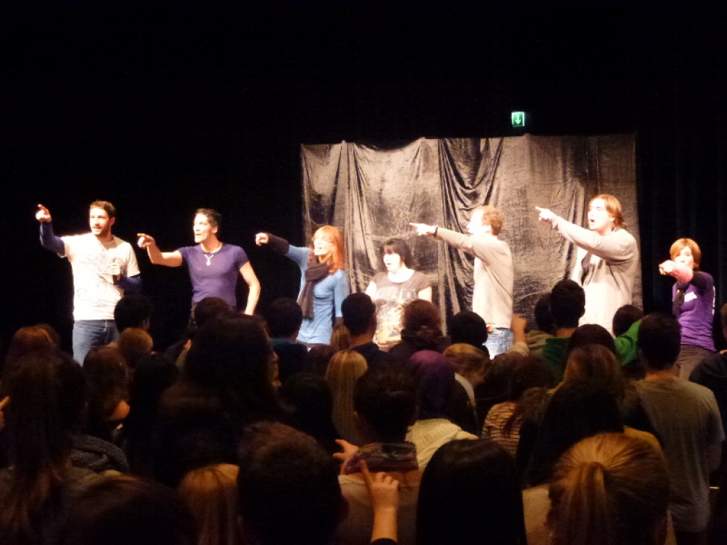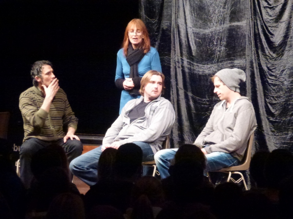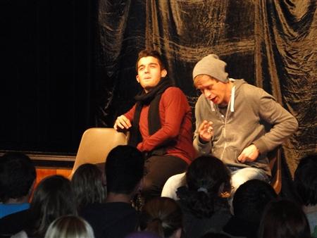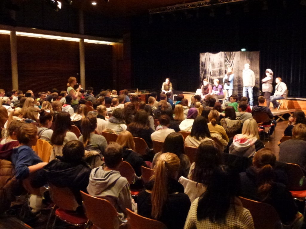 In drei unterschiedlichen Szenen aus Alltagssituationen von Schülerinnen und Schüler wurden die Probleme „Kiffen“, synthetische Drogen und Alkohol aufgegriffen. Anhand der gespielten Sequenzen wurden im Dialog mit dem Publikum Lösungen besprochen. Anschließend durften einzelne Schüler unterschiedliche Handlungsmöglichkeiten auf der Bühne mit den Schauspielern ausprobieren.