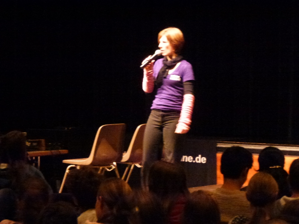 Das Stück „Kartoffelkrise im Schullandheim“ beschreibt den Frust dreier Schüler über die Eintönigkeit der Klassenreise. Diese Langeweile versuchen zwei der drei Schüler mit einem Joint zu vertreiben. In der zunächst gespielten Handlung werden alle drei Schüler von der Lehrerin erwischt und als Konsequenz nach Hause geschickt. Die Moderatorinnen suchten anschließend mit Schülerinnen und Schülern aus dem Publikum nach Reaktionsmöglichkeiten des nichtbeteiligten Schülers. Gekonnt überzeugte zum Beispiel Güney Timur von der Dr.-Engel-Realschule auf der Bühne seine Freunde davon, ihn von dem unberechtigten Verdacht freizusprechen. Spätestens mit dem Auftritt von Güney war das Eis bei den Schülerinnen und Schülern gebrochen und das Programm wurde mit großem Interesse und Eigeninitiative verfolgt.