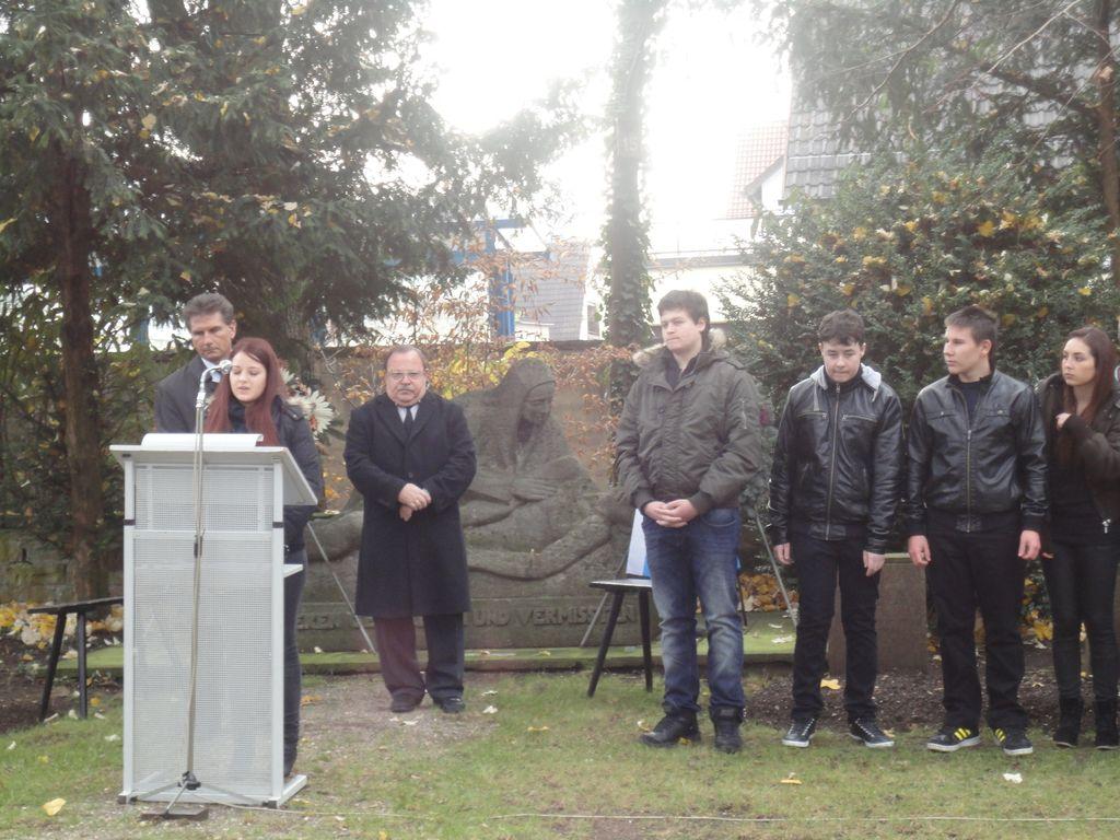 Der Vorsitzende des Ortsverbandes des VdK Baden-Württemberg, Rudi Münd, ging in seiner Rede der kritischen Frage nach, ob der Volkstrauertag heute überhaupt noch aktuell sei und belegte dies anschaulich durch Beispiele aus gegenwärtigen Kriegsgebieten. Er warb bei den Jugendlichen um gegenseitige Toleranz und Verständnis füreinander.
