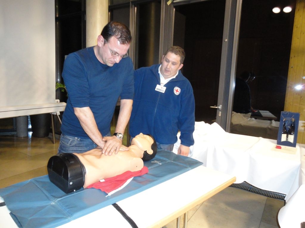 Rüdiger Trautmann und Sven Fainer von der DRK-Bereitschaft Eislingen rundeten den Ehrungsabend mit einem Einblick in ihre Arbeit ab. In einer kurzweiligen Power-Point-Präsentation klärten sie über den vielseitigen Einsatz des DRKs im Landkreis Göppingen auf und zeigten den geladenen Blutspendern in einer anschaulichen Demonstration, wie im Ernstfall ein Ersthelfer am Unfallort eine Wiederbelebungsmaßnahme mit einer Herzdruckmassage durchführen sollte.