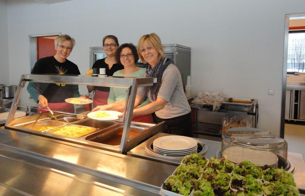 Im Bild: Mensa-Leiterin im Ösch Cornelia Meindl (re.) mit ehrenamtlichen Kräften, die wesentlich dazu beitragen, dass die Akzeptanz bei den Schülern gestiegen ist.