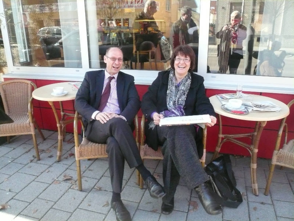 'Das ist ein Schock für uns', so die einhellige Reaktion der Eislingerinnen und Eislinger auf die Hiobsbotschaft letzte Woche, dass das seit acht Jahren sich größter Beliebtheit erfreuende 'Kaffeehaus' Da Damiano in der Hauptstraße Ende Februar schließen wird. Der Treffpunkt für vielerlei Gruppen und Mittagstisch für die anliegenden Betriebe ('Weckerles Kantine' sagten einige) hat sich zu einem Highlight des Eislinger Lebens entwickelt, konnte man doch beste Konditorwaren, vom Chef selbst gemischte Kaffeesorten und schmackhafte Mittagessen von der Mama gekocht mit einem freundlichen Service bekommen. Damiano Piergiovanni mit BM-Kandidatin Ulrike Haas und Gästen |