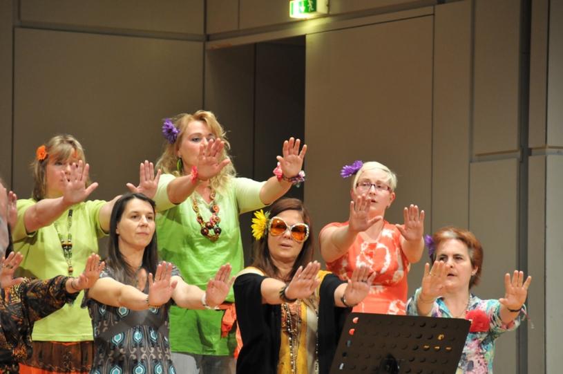 Der Chor InTakt präsentierte sich trotz der nationalen und internationalen Konkurrenz sehr gut mit Ohrwürmern aus den siebziger Jahren, wie California Dreaming, Lollipop, San Francisco, American Pie u.a.. Die Sängerinnen und Sänger waren passend zur Flower-Power-Zeit gekleidet, was beim zahlreichen Publikum gut ankam (entsprechende Bemerkungen nach dem Konzert). Das Repertoire des Chor InTakts brachte den Hegelsaal zum „Swingen“- es wurde mitgesungen, geschnipst und geklatscht. Die Zuhörer belohnten den Vortrag mit frenetischen Beifall und da Applaus wirklich das Brot der Künstler ist, muss der InTakt an diesem Abend sehr satt gewesen sein. Spontan wurde der InTakt, dann auch noch als einziger Chor, gebeten, eine Zugabe zu geben. Diesem Wunsch kamen die InTakler gerne nach. Nun hoffen sie auf ein Wiedersehen in diesem Rahmen.
