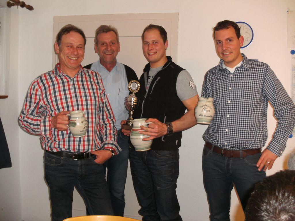 Immerhin 21 Möste wurden eingereicht, wobei der eine oder andere Schwabentrunk nicht nach dem Geschmack der Verkoster war. So gab es nach der Auswertung der Punktevergaben recht unterschiedliche Ergebnisse von 36 Punkten bis 152,5 Punkten für den Siegermost. Es stellte sich wieder heraus, dass die Möste der Familie Geiger fast unschlagbar sind, wobei diesmal der Sohn Tobias Geiger als Erstplatzierter seinen Vater Bernd Geiger auf den dritten Platz verwies. Platz zwei belegte Tobias Wahl. Den Siegerpokal und die handgetöpferten Mostkrüge überreichte der 2. Vorsitzende Wolfgang Blessing.