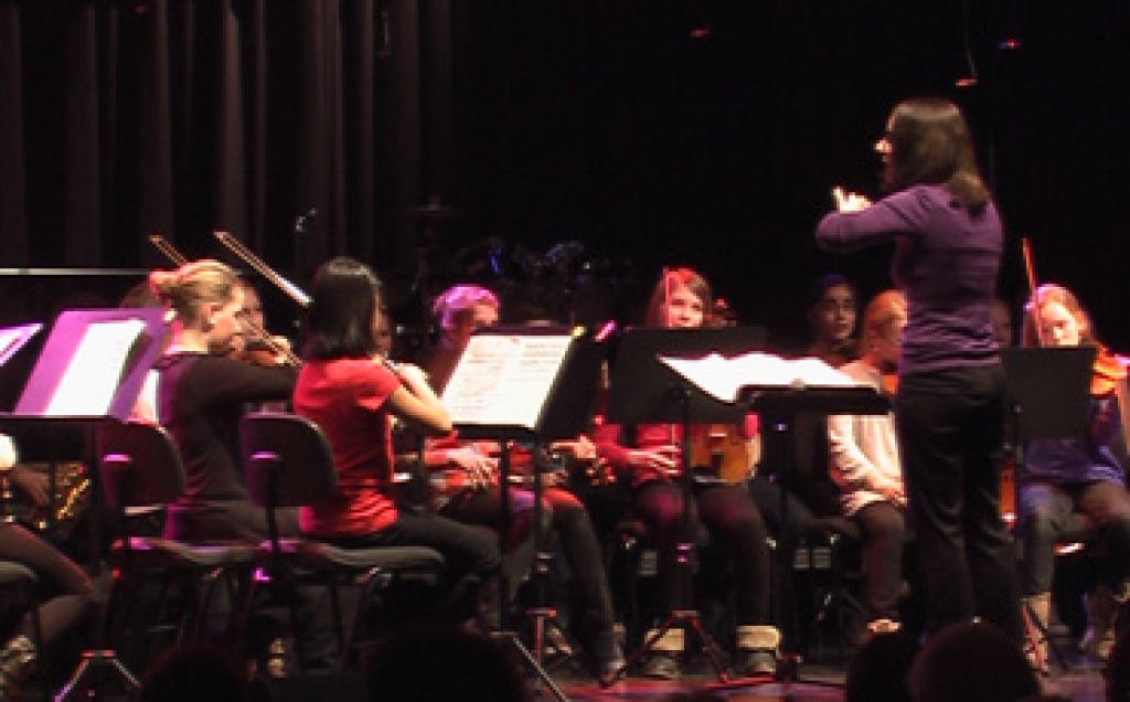 Der Unterstufenchor (Leitung Annette Bolz, am Flügel Markus Zimpel) leitete dann beschwingt und fröhlich mit vier Stücken die Pause ein. Bevor diese eingeläutet werden konnte, stand Frau Bolz vor einer besonderen Herausforderung. Abgesehen davon, dass sie trotz einer fiebrigen Erkältung 'ihre Frau' stand, musste sie eine kleine Umbauphase - das letzte der vier Stücke begleitete das Unterstufenorchester - als Moderatorin überbrücken. Dabei forderte sie das Publikum mit einem intellektuellen Witz heraus: Kommt eine Fermate zum Psychiater und sagt: 'Ich halt´s einfach nicht mehr aus!' Mit viel Gelächter ging es an den von der SMV organisierten Ausschank in den Foyers.