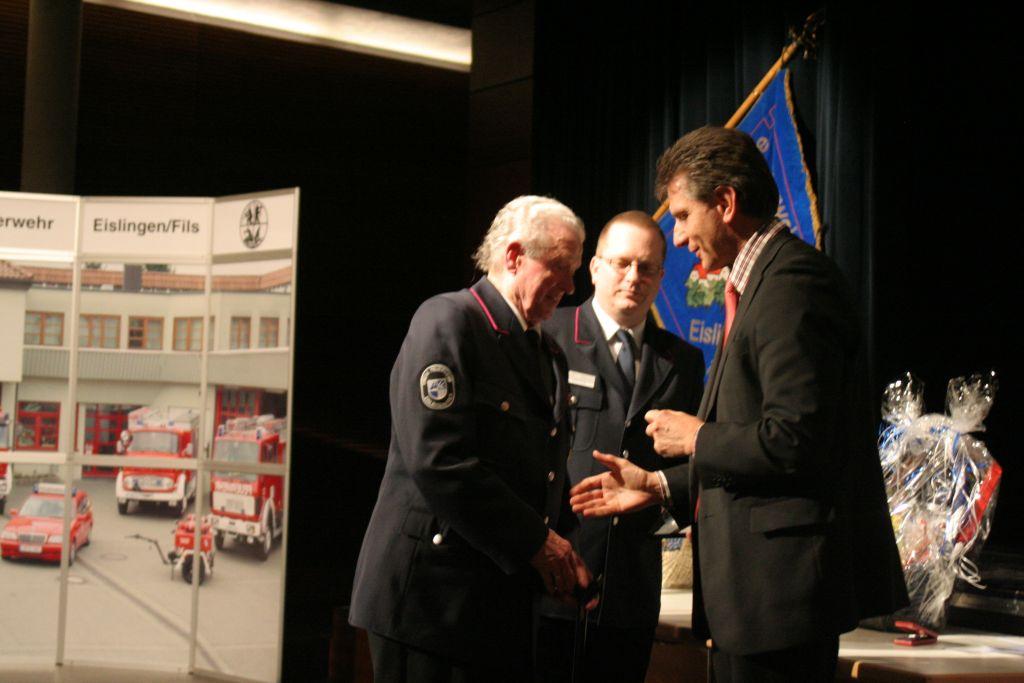 Insgesamt neun Feuerwehrangehörige konnten im vergangenen Jahr in die Eislinger Wehr aufgenommen werden. Der Kommandant konnte im Beisein von Oberbürgermeister Klaus Heininger weiteren neun Feuerwehrangehörigen eine Beförderung aussprechen. Martin Rapp und Dietmar Fröhner wurde für die 25jährige Mitgliedschaft in der Feuerwehr geehrt. Für die 50jährige Mitgliedschaft in der Eislinger Feuerwehr konnte Otmar Frey und für die 60jährige Mitgliedschaft Horst Schöder geehrt werden. Eine nicht alltägliche Ehrung konnten dann der Kommandant und Oberbürgermeister Gerhard Rupp aussprechen. Gerhard Rupp trat im Jahr 1943 in die Eislinger Feuerwehr ein und ist bis einschließlich heute immer noch Mitglied der Wehr. Als kleines Präsent für 70 Jahre Mitgliedschaft bekam der Jubilar von der Eislinger Feuerwehr eine Wetterstation und von dem Stadtverwaltung ein Blaulichtwasser überreicht. Auch der Oberbürgermeister schloss sich den Gratulanten an.