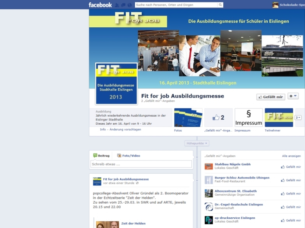 Neu ist in diesem Jahr der speziell für die Messe erarbeitete Facebookauftritt. Hier soll den Jugendlichen die Möglichkeit gegeben werden, sich im Vorfeld über die Firmen zu informieren, soweit diese in Facebook präsent sind.