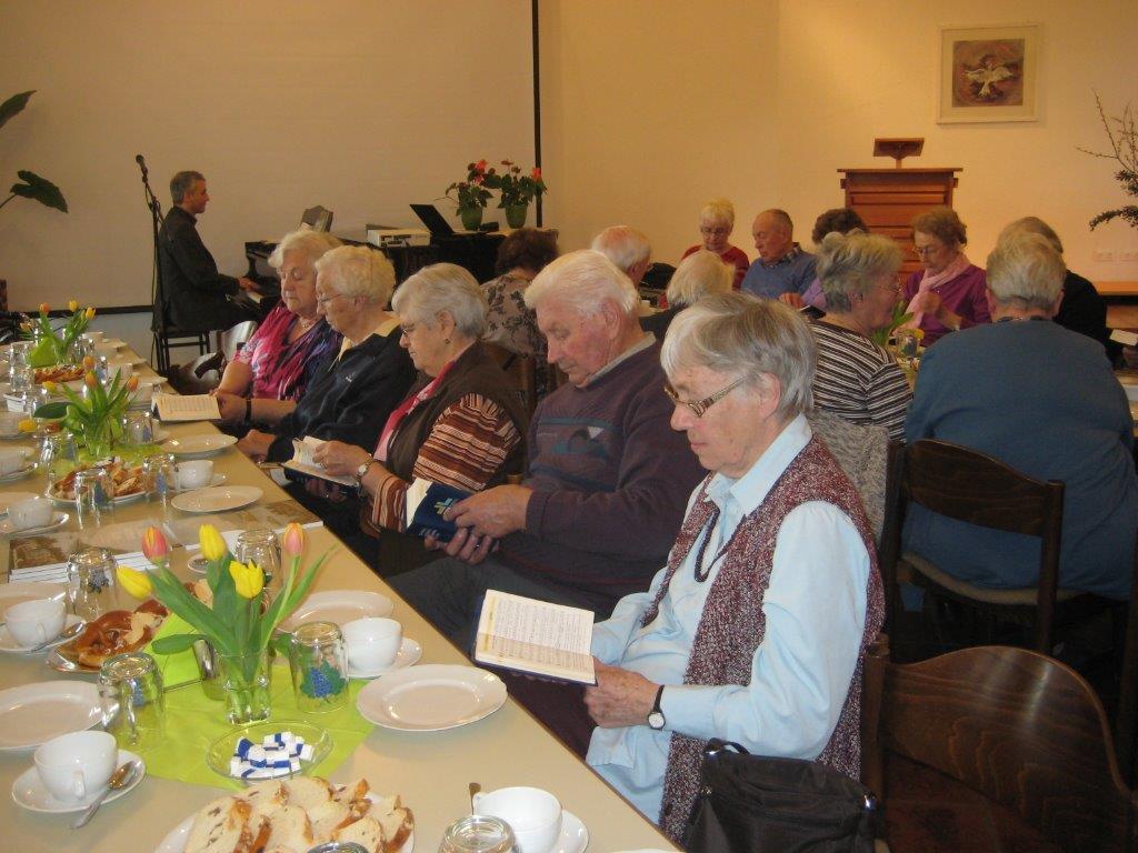 Pfarrer Dehlinger begrüßte die Gäste im tulpengeschmückten Gemeindehaus, das Eingangslied „Gelobt sei Gott„ leitete über zum Osterevangelium nach Joh. K. 20,und der Ansprache darüber. Mit einem Gebet und weiteren Liedversen endete die Andacht. Bei Kaffee, Hefezopf und Butterbrezeln wurde miteinander geredet und gelacht, zum Abschluss wurden die Wunschlieder der Geburtstagskinder Melitta Ziegfeld, Hermann Walter und Erika Florin gesungen. Das Singen mit Klavierbegleitung machte allen so viel Freude, dass noch mehrere Liedwünsche erfüllt wurden.