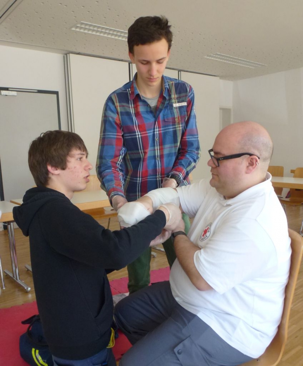 So mussten Sebastian und Toni den „gestürzten Patienten“ Rüdiger Trautmann versorgen. Die angehenden Jugendsanitäter reagierten besonnen, fragten genau nach, legten eine Schiene ans verletzte Handgelenk an und erklärten dem Patienten dabei ruhig, was sie taten. Auch die Leitstelle alarmierten sie vorbildlich. Vergessen hatten sie bloß die so genannte DMS-Kontrolle. Dabei werden die Durchblutung, die Motorik und die Sensorik des bandagierten Gliedmaßes geprüft. Toni ärgerte sich über diesen Schnitzer. Nach einem stärkenden Mittagessen mit Schnitzel, Fleischküchle, Spätzle und Salat ging es in die weiteren Prüfungsrunden. Am Nachmittag dann die erleichternde Nachricht: Alle hatten bestanden und erhielten neben einem Zertifikat auch eine rote DRK-Jacke, die zeigt, dass sie verlässliche Helfer im Notfall sind.