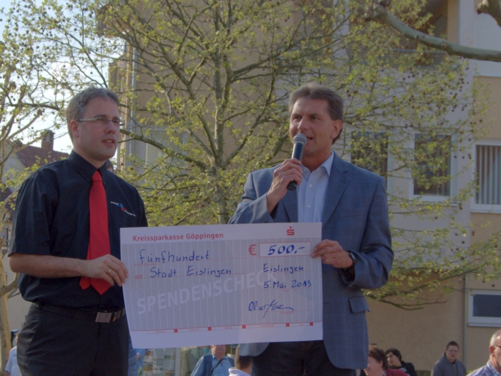 Am Ende der Veranstaltung gegen 18:00 Uhr konnte Oberbürgermeister Heiniger ein Spenden-Scheck vom Vorsitzenden des Eislinger Marketing e.V. Oliver Marzian entgegen nehmen. Der auf 500 Euro aufgestockte Spendenbetrag, der beim letzten Kreiselfest zusammengekommen war, soll für eine Ruhebank am Hallenbad in Eislingen-Süd verwendet werden.