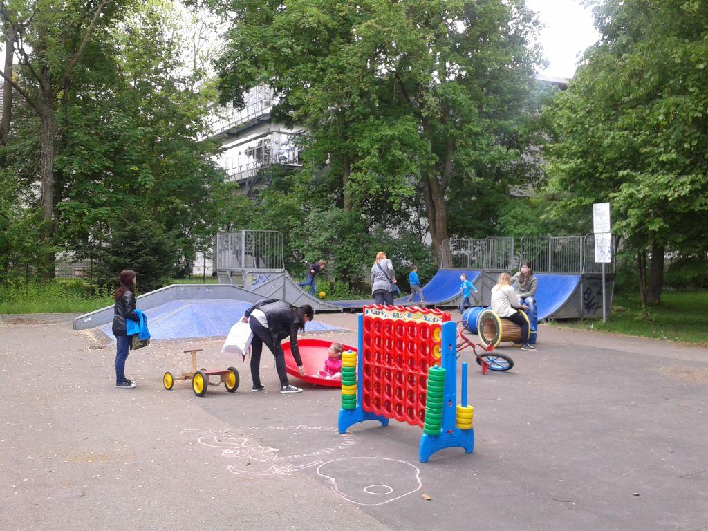 Stelzen, Pedalos, ein großes Vier- gewinnt – Spiel, Bälle, Roller, Kullerschale, ein Tischkicker, Schwungtuch und weitere Spielgeräte, die nicht auf Spielplätzen zu finden sind, wurden von den Kindern gerne ausprobiert und ausdauernd bespielt. Bei vielen Spielen war Geschicklichkeit und Teamarbeit gefragt.