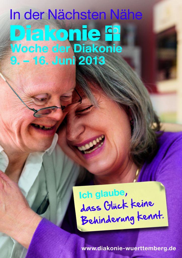 Auf dem Plakat zur Woche der Diakonie sind in diesem Jahr zwei Menschen zu sehen. Sie lachen und umarmen sich. Auf dem Post-It ist dazu zu lesen 'Ich glaube, dass Glück keine Behinderung kennt“ - so lautete das Motto der diesjährigen „Woche der Diakonie“.