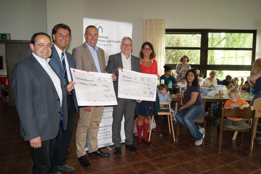 Die Stiftung Alten- und Familienhilfe Eislingen hat es sich zur Aufgabe gemacht, aus dem Zinserlös ihres Kapitals für soziale Projekte auszuschütten. In den letzten Jahren konnten auf diesem Weg bereits über 50.000 Euro an soziale Projekte und Maßnahmen gespendet werden. Die Mitglieder des Vorstandes und des Beirates hatten sich kürzlich einvernehmlich darauf festgelegt, aus dem Erlös des Jahres 2012 an dieser Tradition festzuhalten und die genannten Projekte in Eislingen finanziell zu unterstützen: Das Altenzentrum erhielt eine Zuwendung zur Beschaffung eines mobilen Holzgrills, der Familientreff Eislingen möchte mit dem Geld Projekte in der Babyarbeit finanzieren. Vertreter der Stiftung, OB Klaus Heininger als Vorsitzender des Beirats, BM Herbert Fitterling als Vorstandsvorsitzender und Pfarrer Bernhard Schmid als stellvertretender Vorsitzender, übergaben die Spendenschecks in den Räumen des Familientreffs in die freudig strahlenden Gesichter der Empfänger.