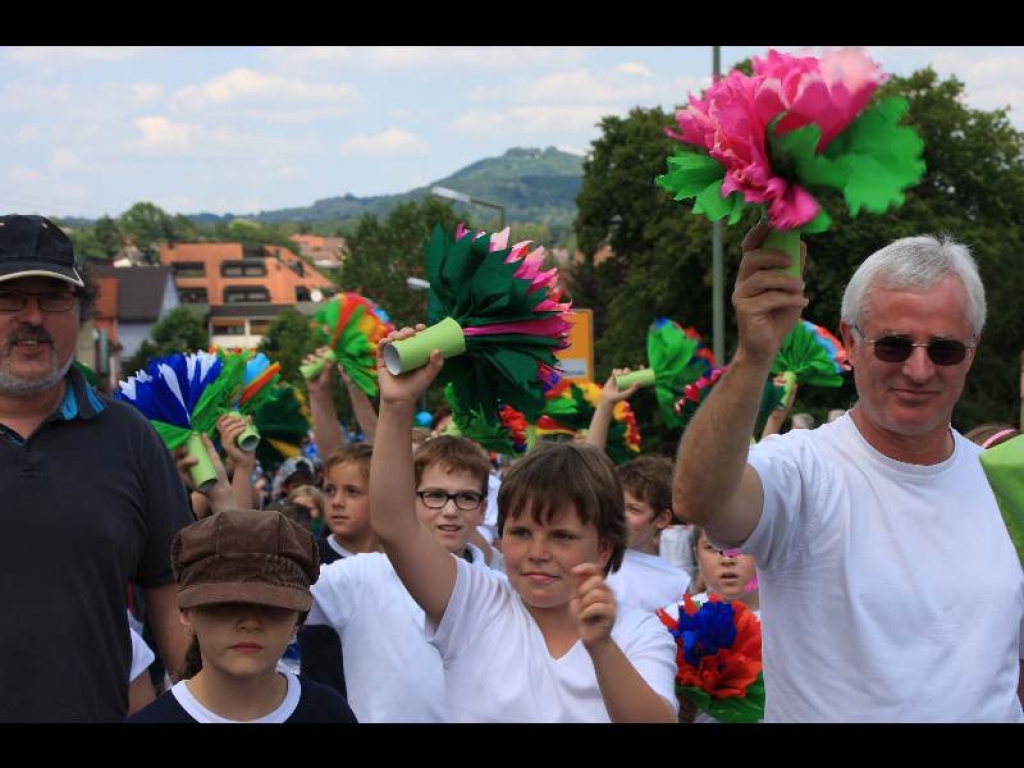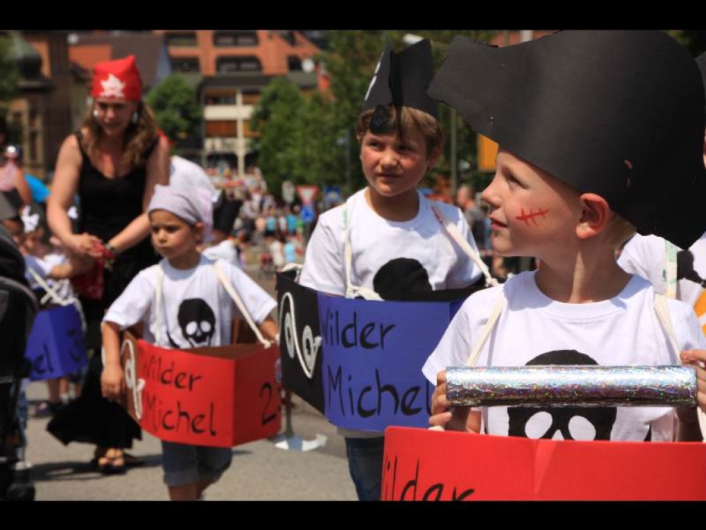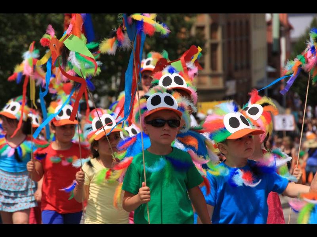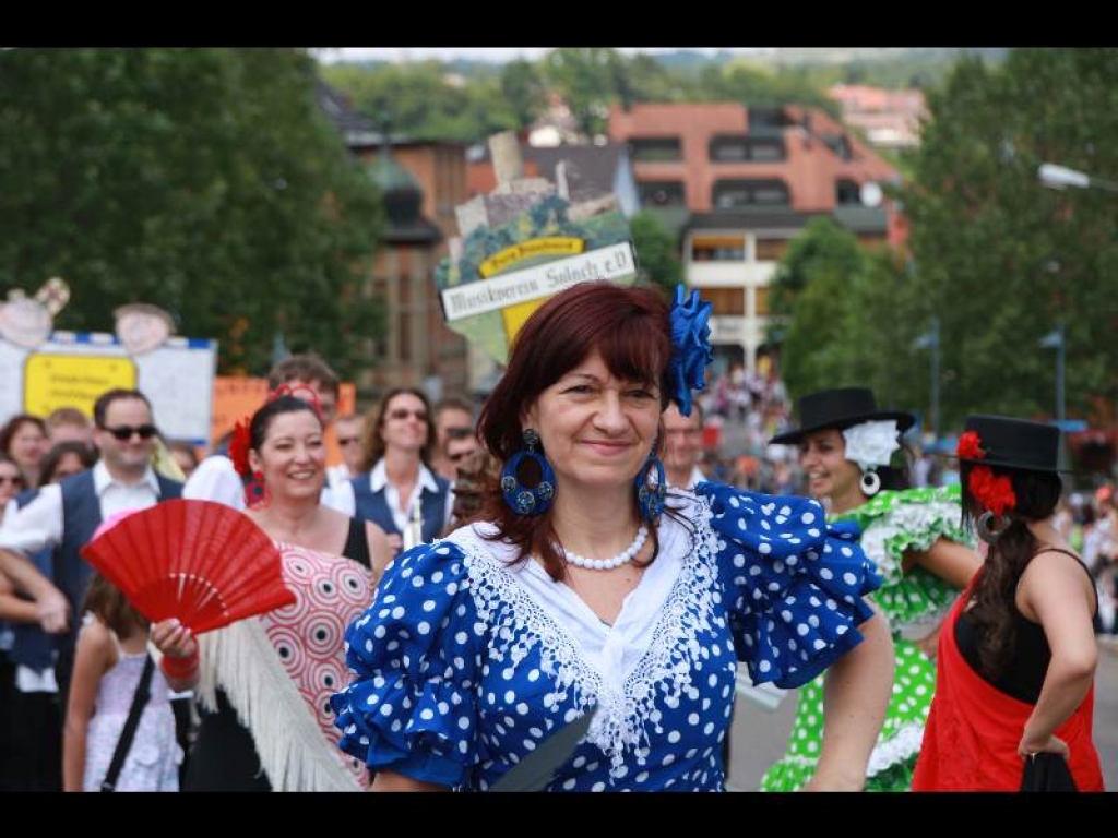 Die Spitze des Zugs mit den |  bunte Kleider |  Nicht nur OB Heininger, auch die Lehrerschaft der Silcherschule wirft Bonbons |