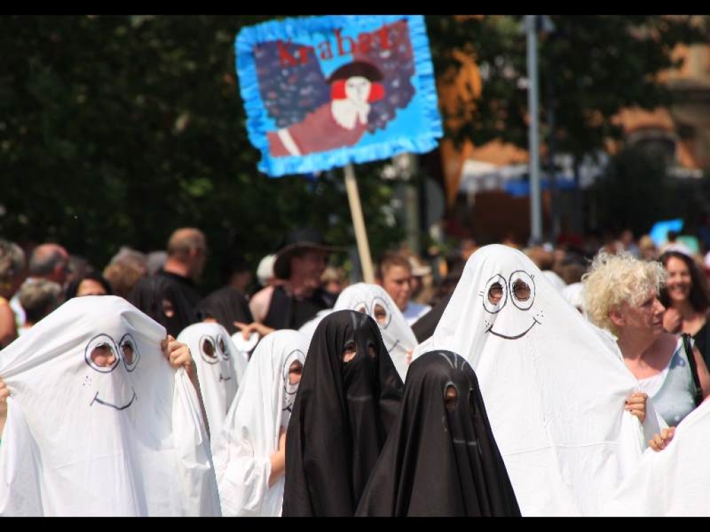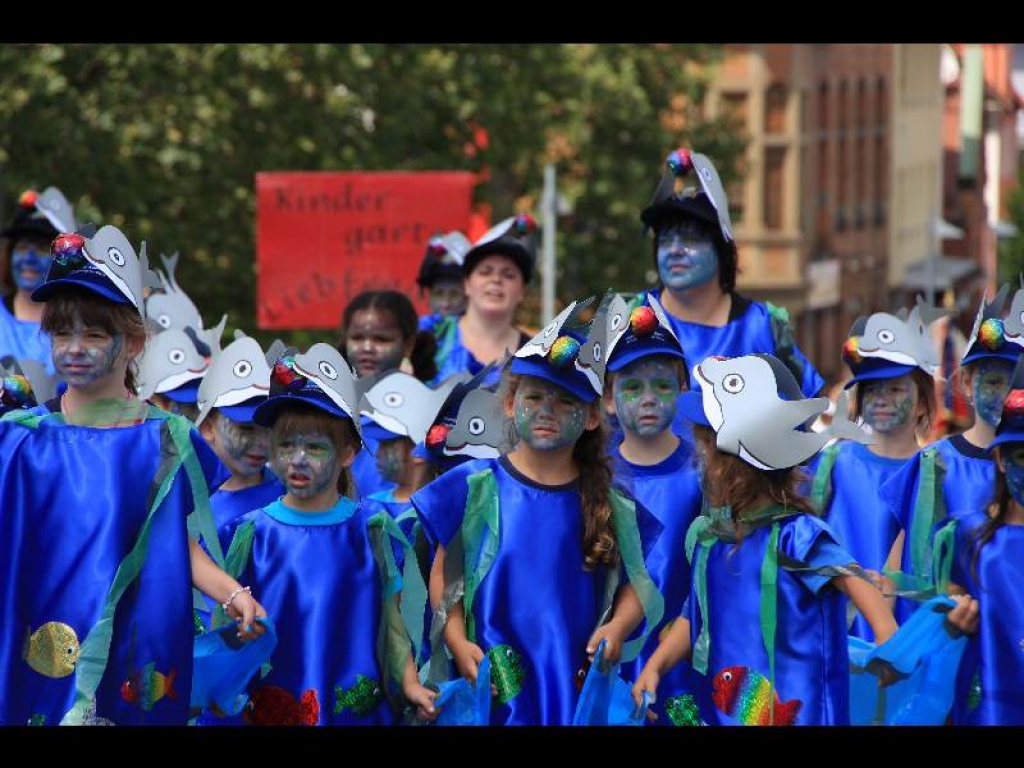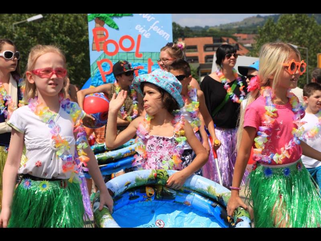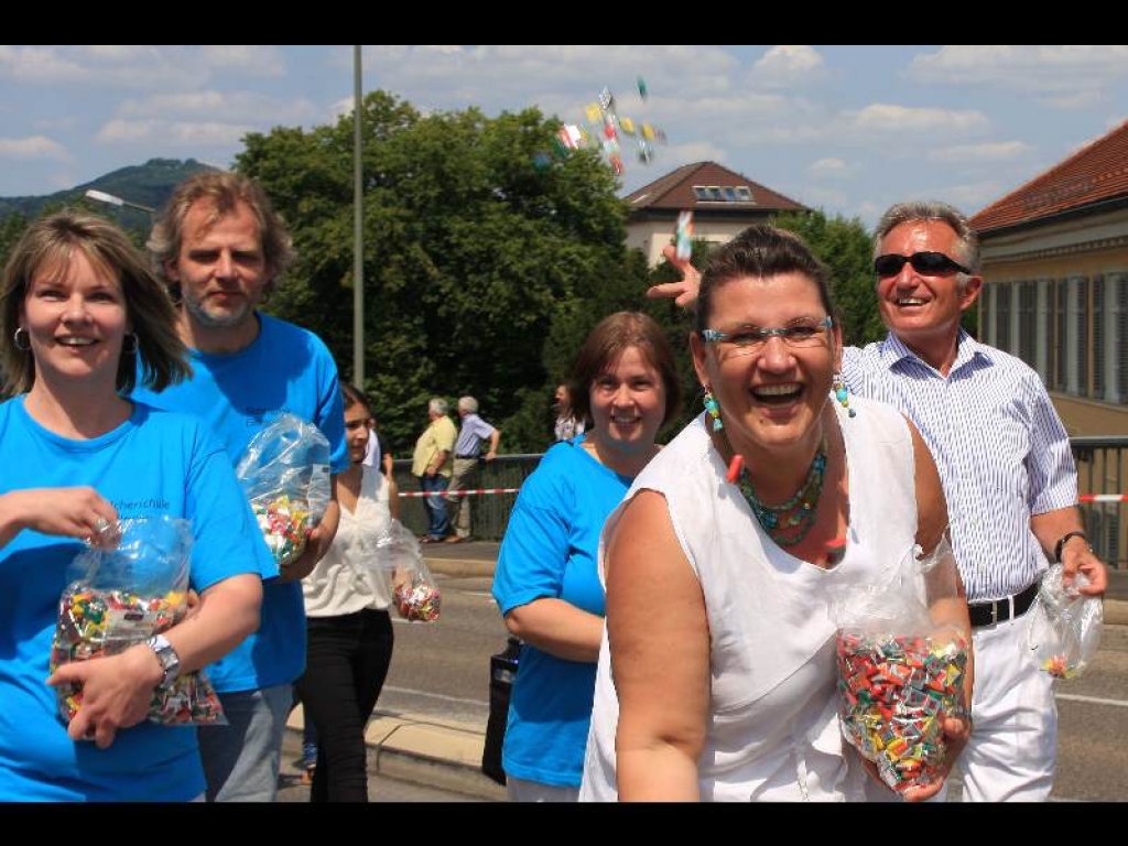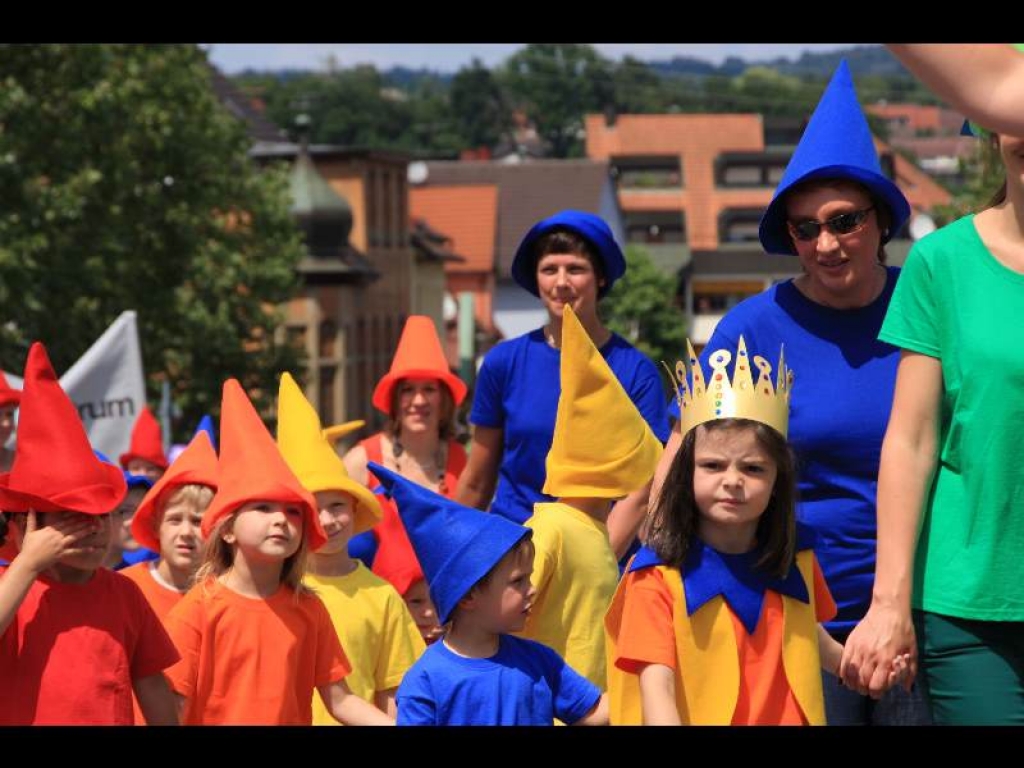 Die Spitze des Zugs mit den |  bunte Kleider |  Nicht nur OB Heininger, auch die Lehrerschaft der Silcherschule wirft Bonbons |