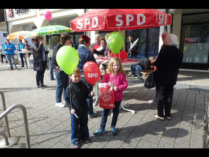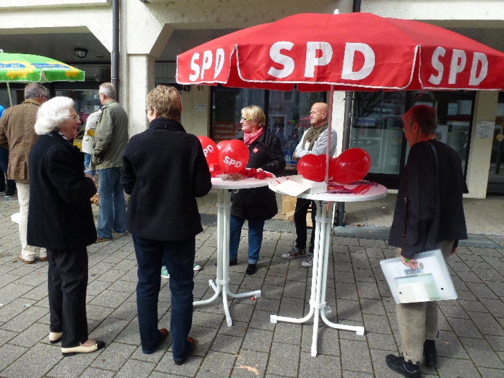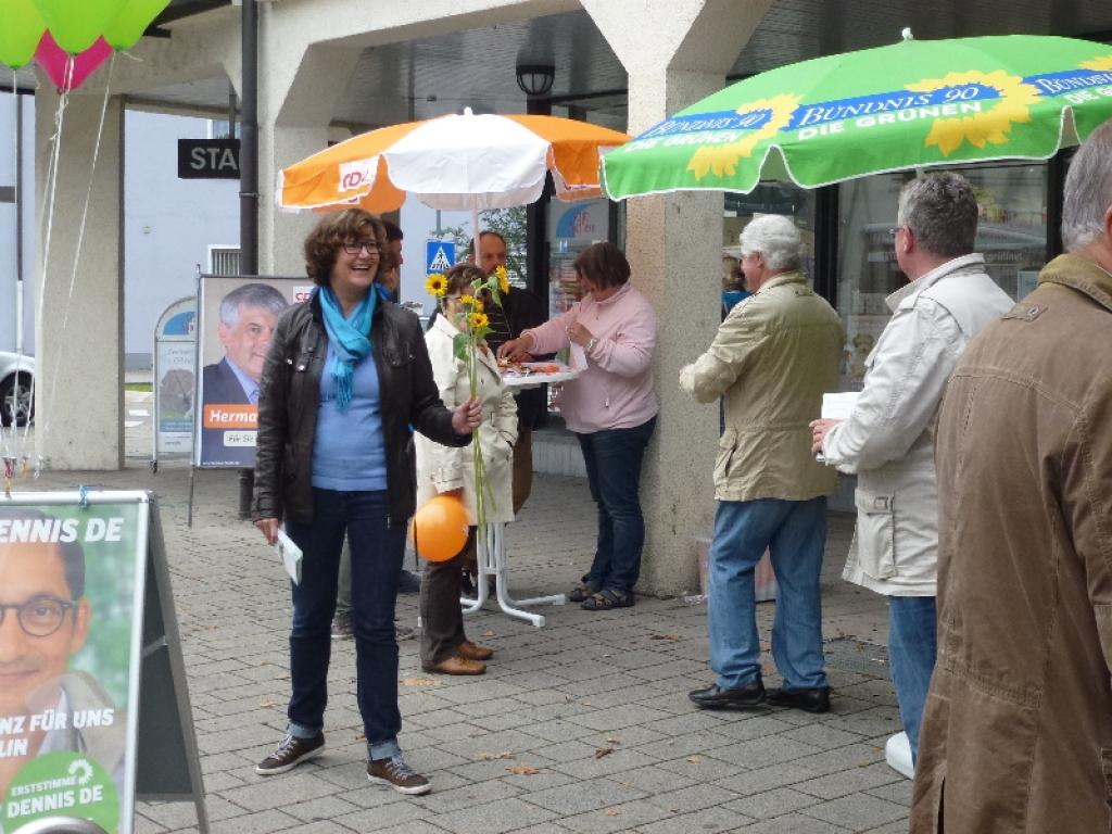 Eislingen vor der Volksbank am Freimann-Kreisel sieht ab 9 Uhr traditionell an den letzten Samstagen die HelferInnen der Parteien mit ihren Sonnenschirmen und Tischen. Gut gelaunt werden die Passanten oder die vorbeifahrenden Autos mit den 'Herschenkerlen', auf deutsch 'Giveaways' beschenkt, Taschentücher ('Nicht weinen, wählen'), Kronkorkenflaschenöffnern ('Das BIER entscheidet'), Sonnenblumen, Prospekten, Brausepulver, Kugelschreibern, Luftballons und vielerlei mehr. Gelegenheit zu Gesprächen über bundespolitische, aber auch Eislinger Themen. So gegen 12 Uhr heute waren dann alle Blumen verschenkt und die Schachteln leer. Der Opa fotografiert die NochnichtwählerInnen |