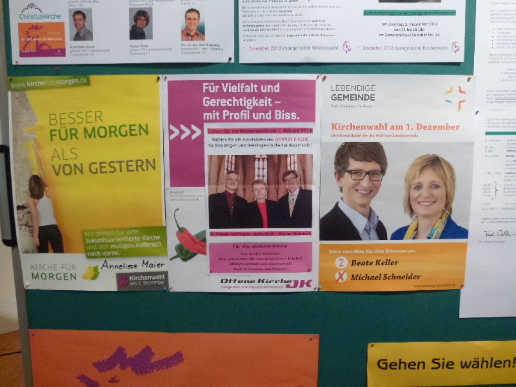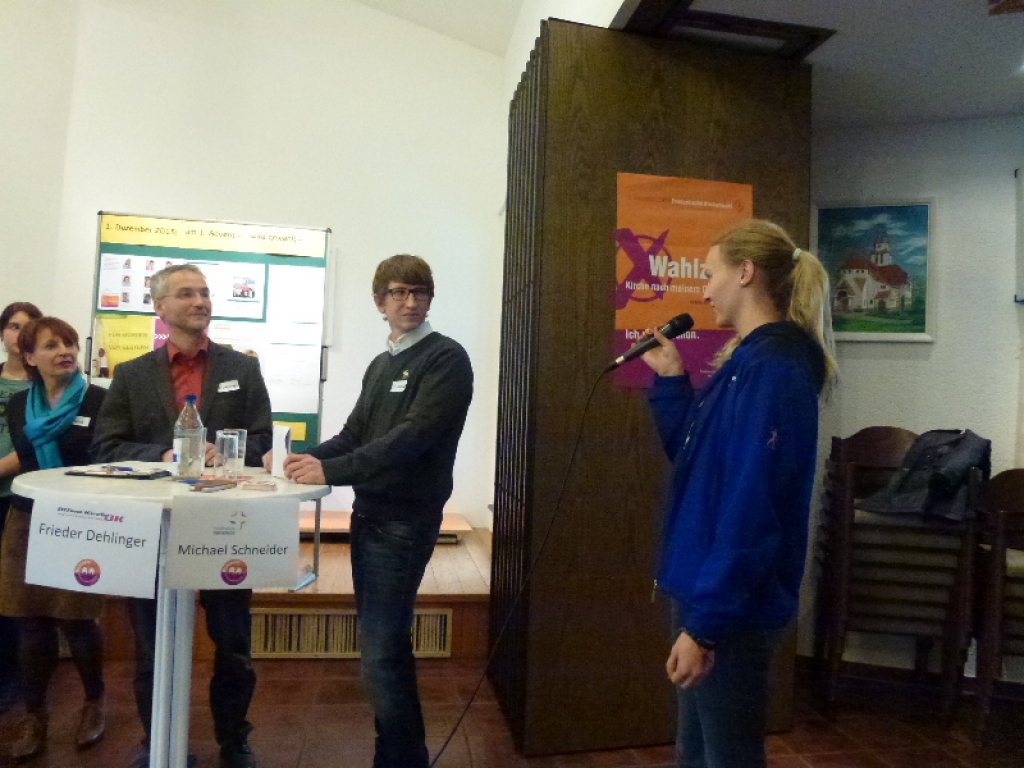 Schuldekanin Annette Leube munterte die Jugendlichen auf, als konfirmierte Christen den Mund aufzumachen sollten, d.h. am 1. Dezember 2013 zur Wahl zu gehen. Das Wahllokal im Gemeindesaal der Christuskirche ist von 11 bis 18 Uhr geöffnet, auch in Krummwälden und auf dem Weihnachtsmarkt kann in mobilen Wahlurnen gewählt werden.