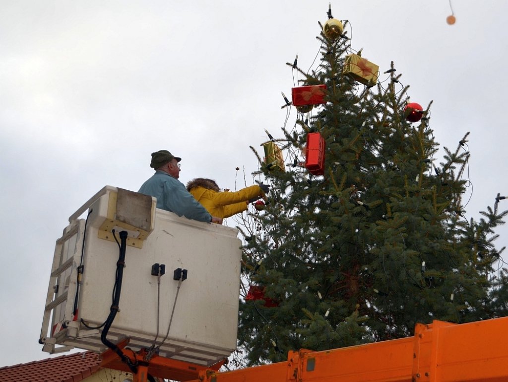 Um 15 Uhr rückte Jochen Weller vom Eislinger Marketing e.V. und sein Team, bepackt mit Weihnachtpäckchen und Kugeln an. Unterstützt wurden sie dabei von einem Hubsteiger. Michaela Holz schmückte den Baum von oben bis hinunter in ca. 2,50 Höhe. Schließlich soll der Baumschmuck noch einige Zeit am Baum hängen und nicht spurlos verschwinden.