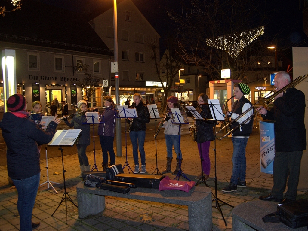 Um 17 Uhr schließlich fanden sich die Bläser der Dr. Engel-Realschule, die Kinder der Kindergärten der Christuskirche und Pfiffikus begleitet von ihren Eltern ein, um den festlich geschmückten Baum einzuweihen.